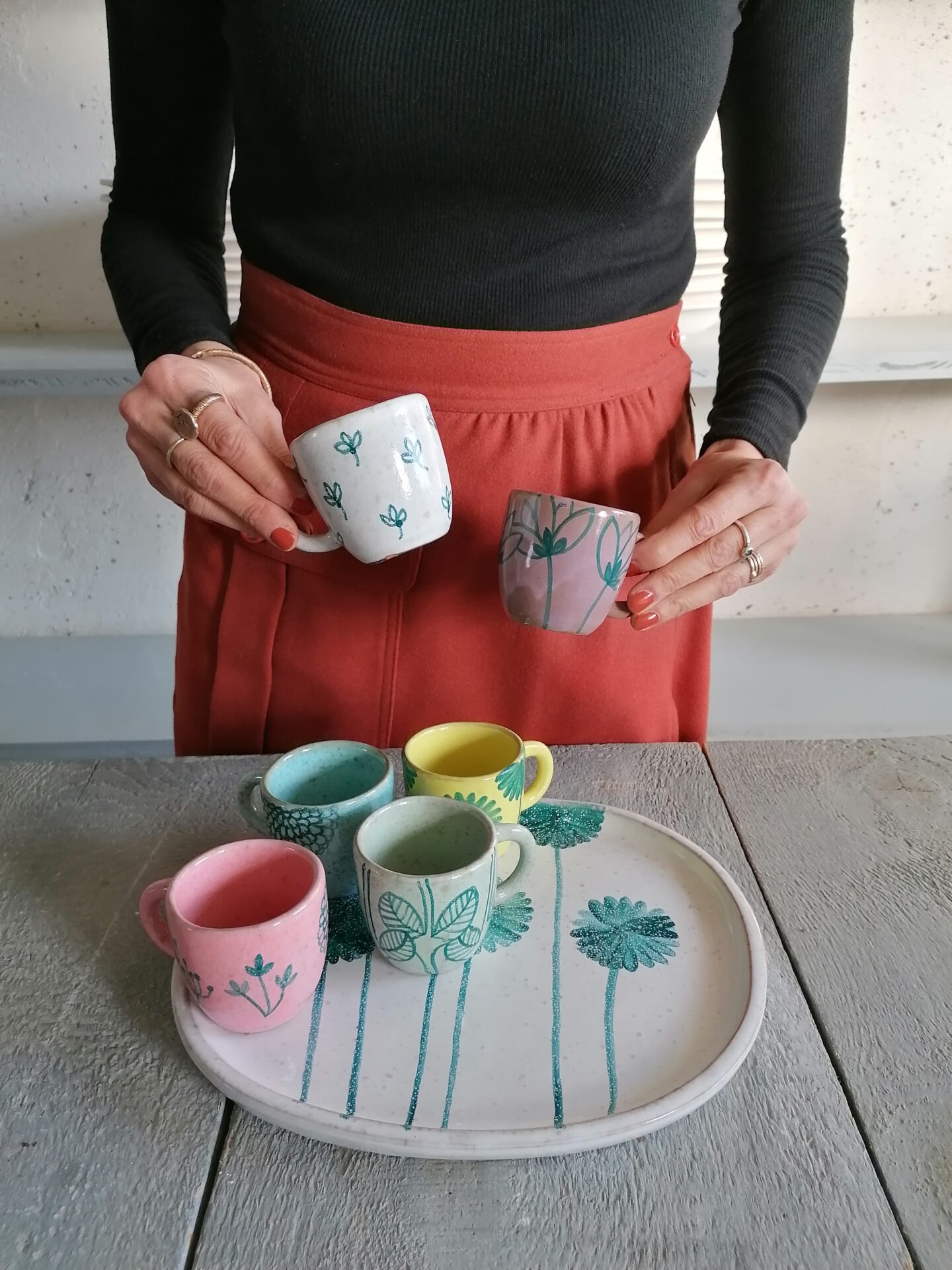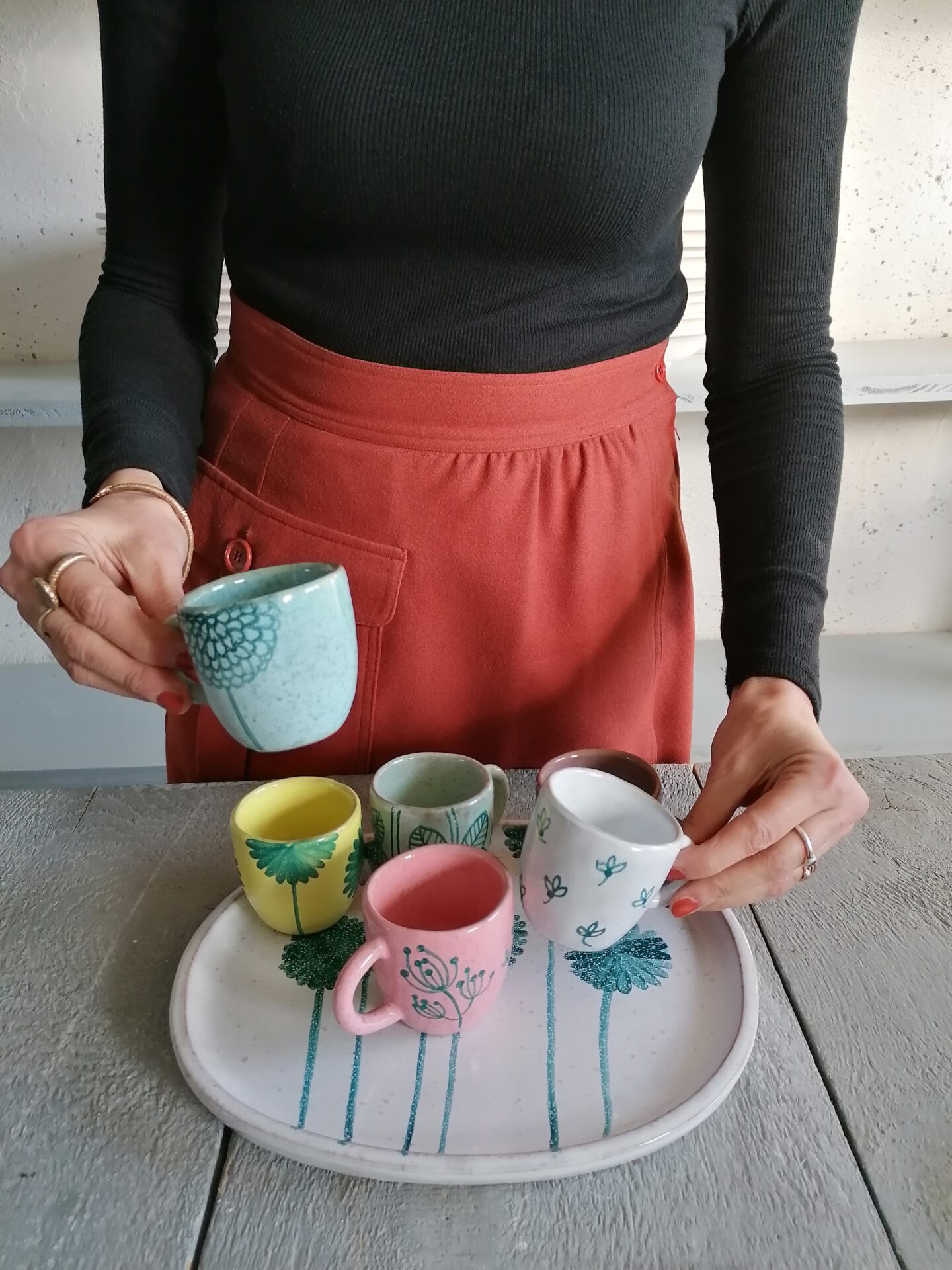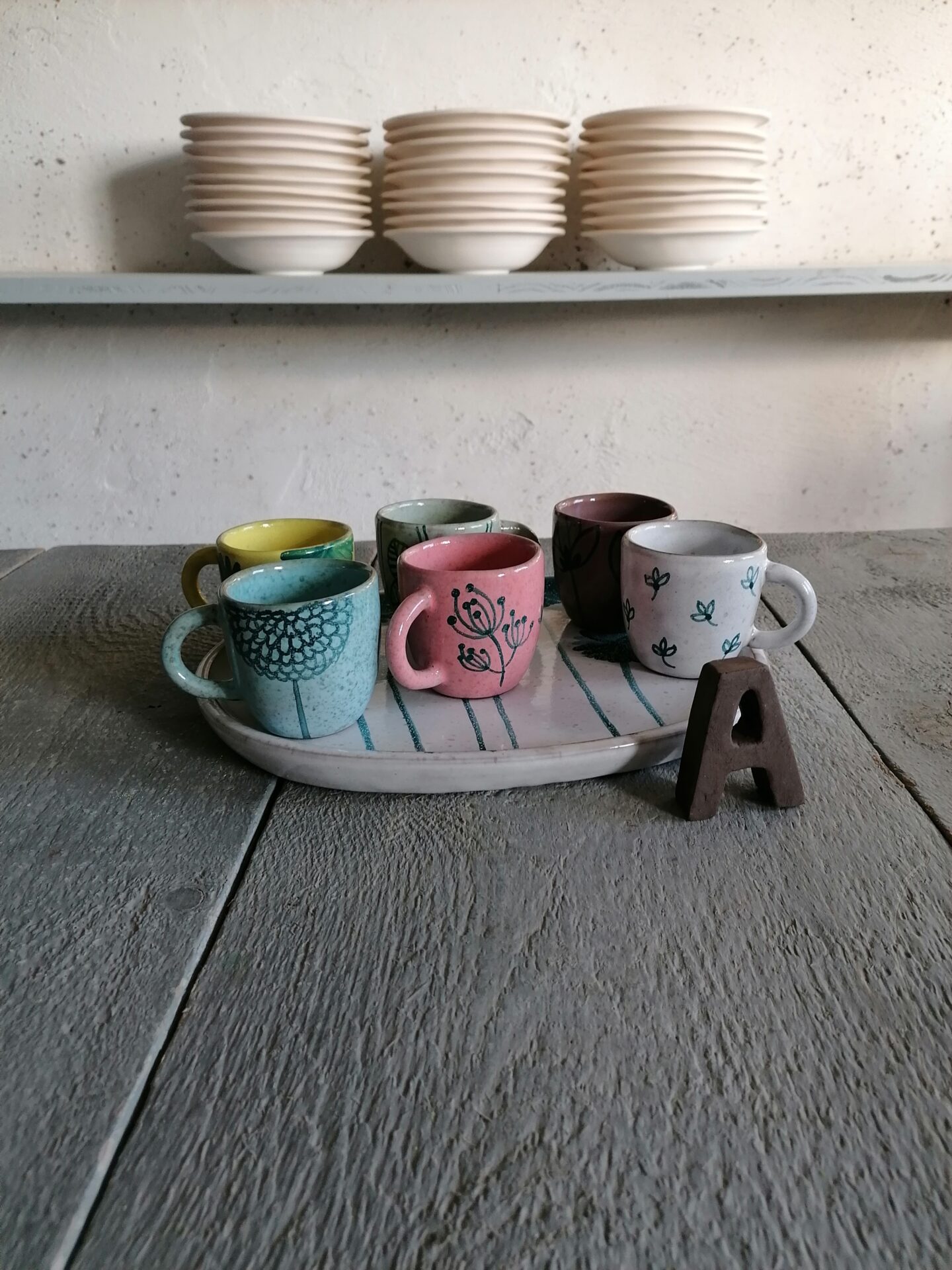 Tazzine e vassoio in ceramica realizzata e decorata a mano, in argilla rossa
