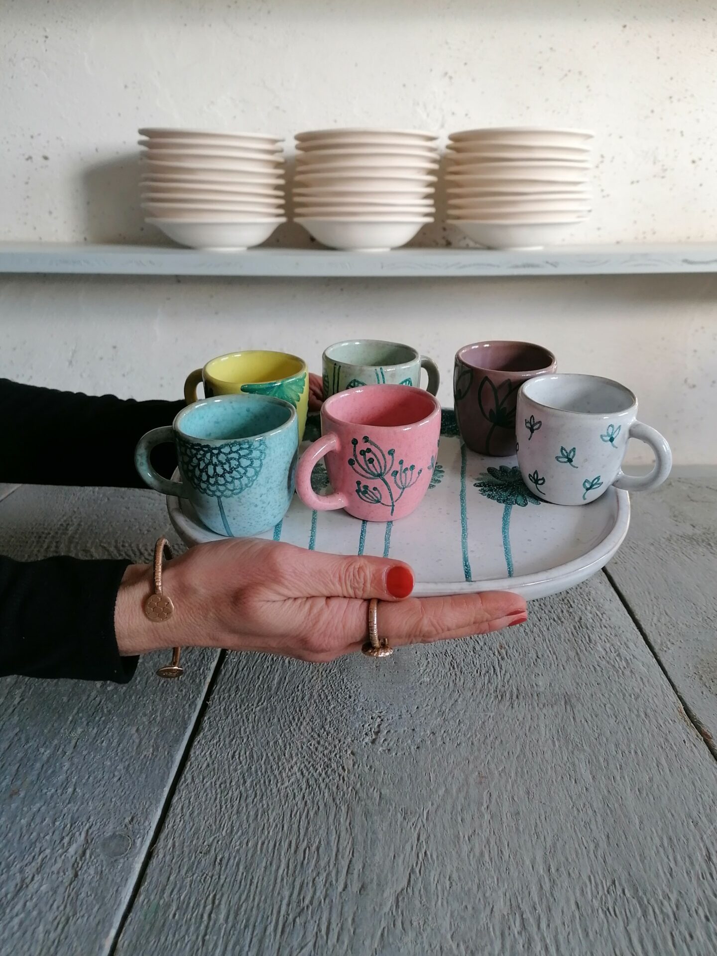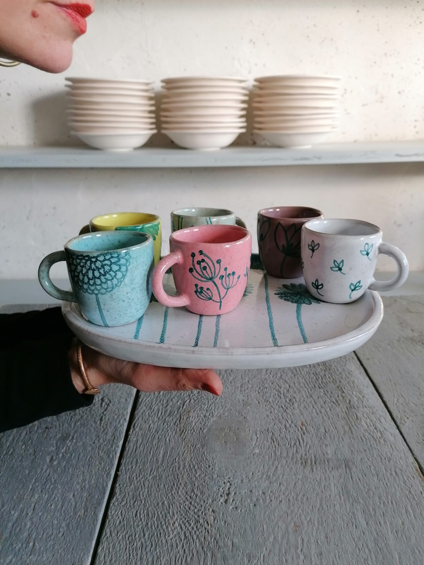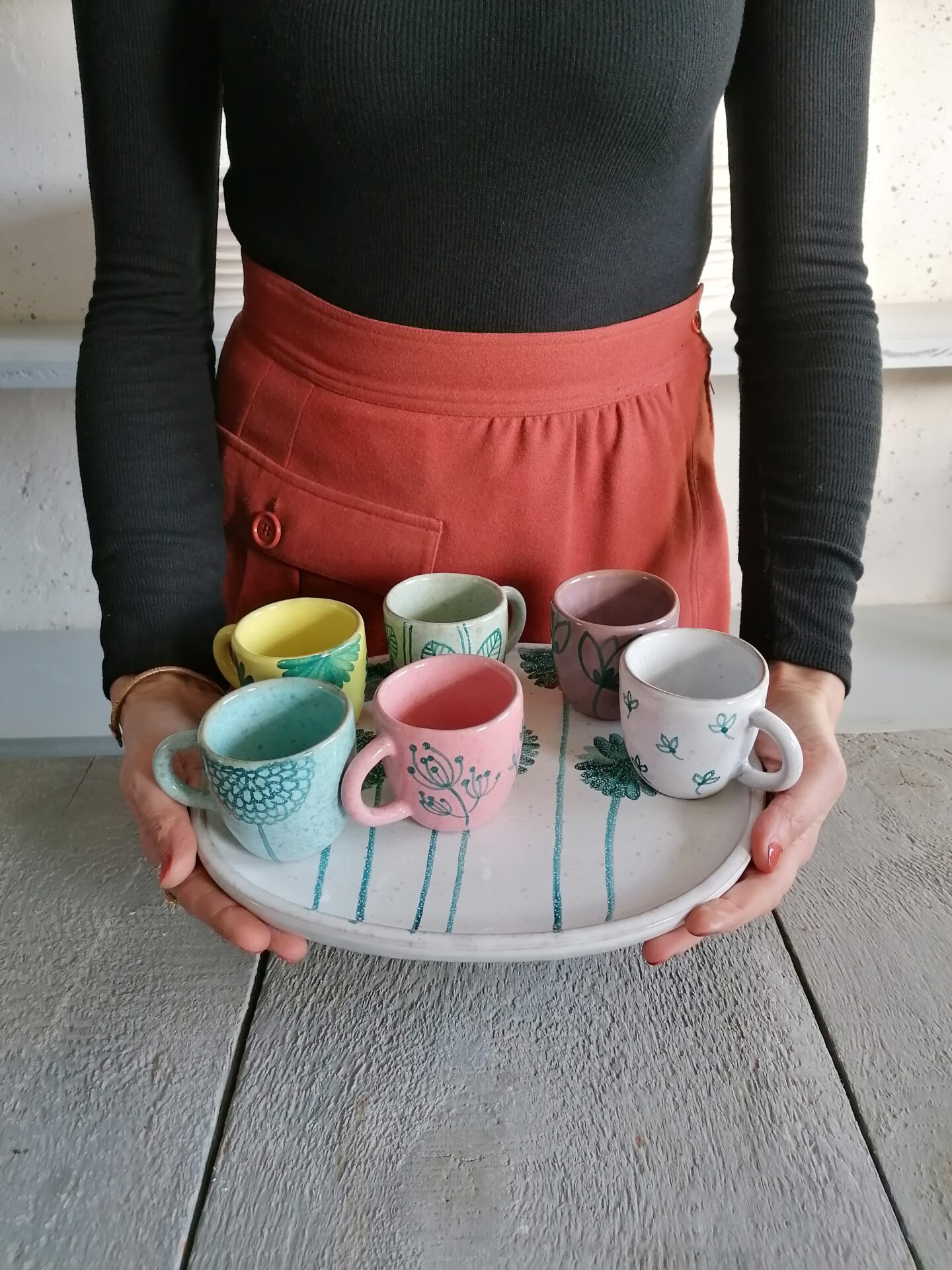 Set di tazzine da caffè completo di vassoio interamente prodotto e decorato a mano.