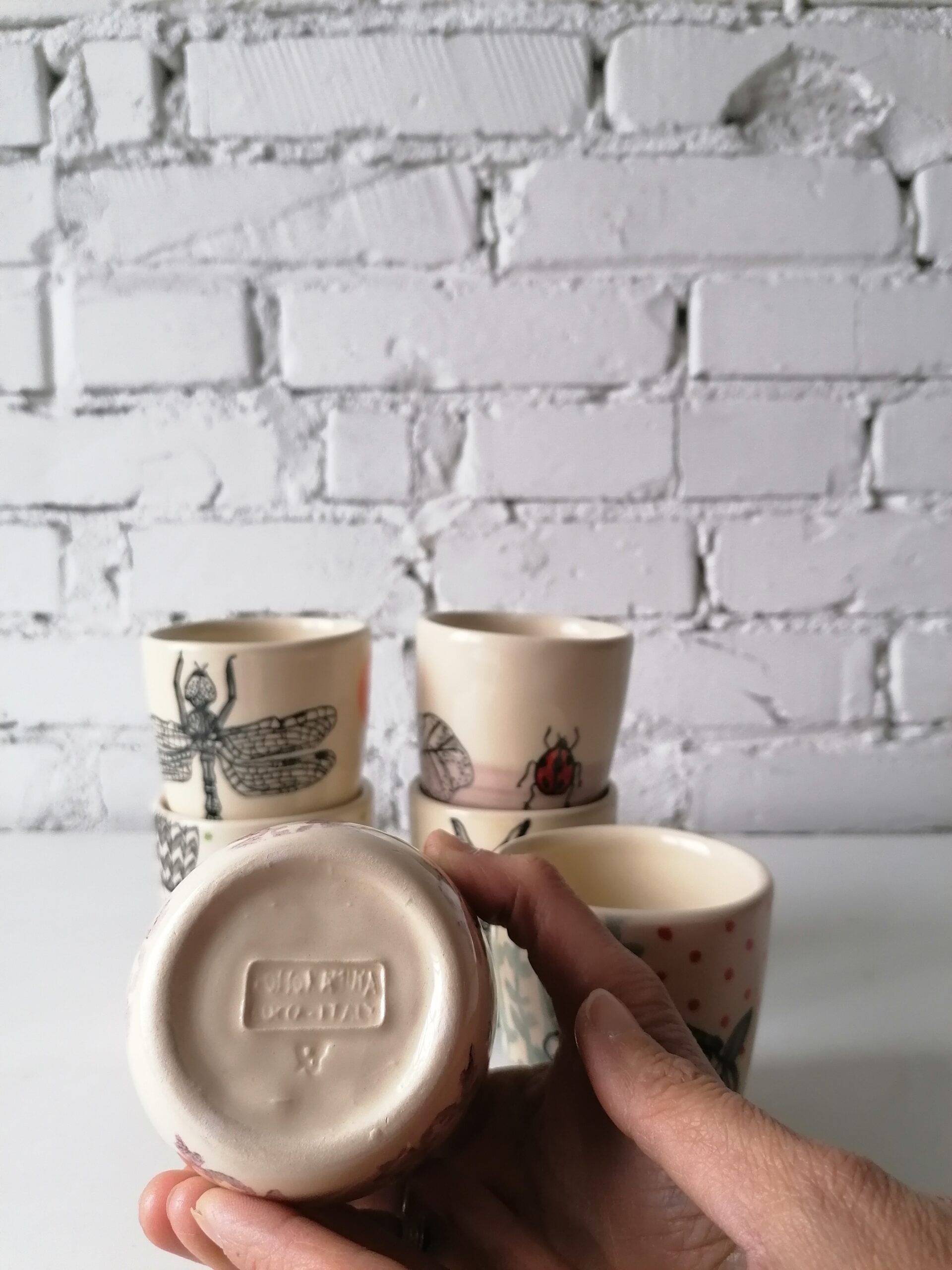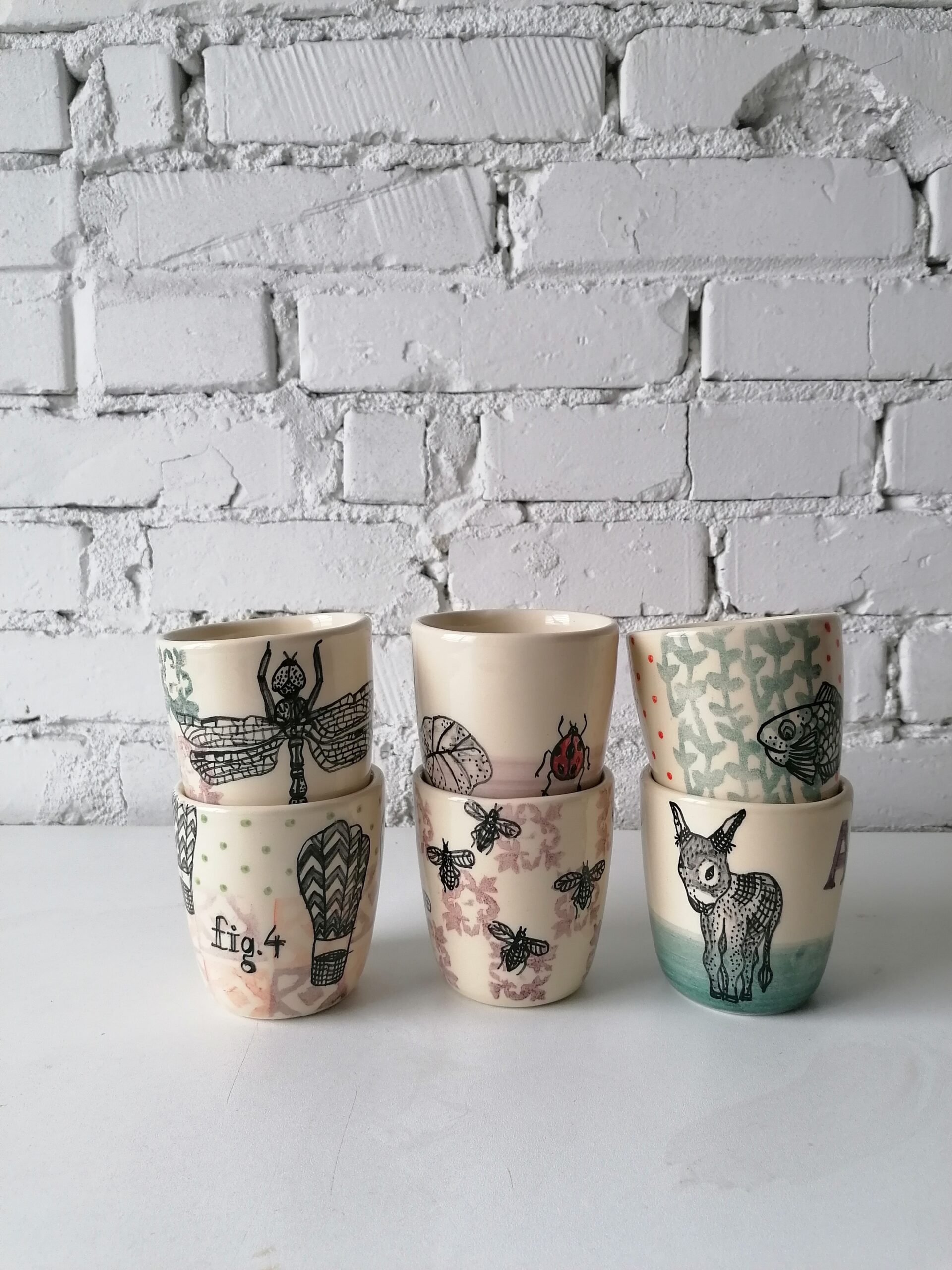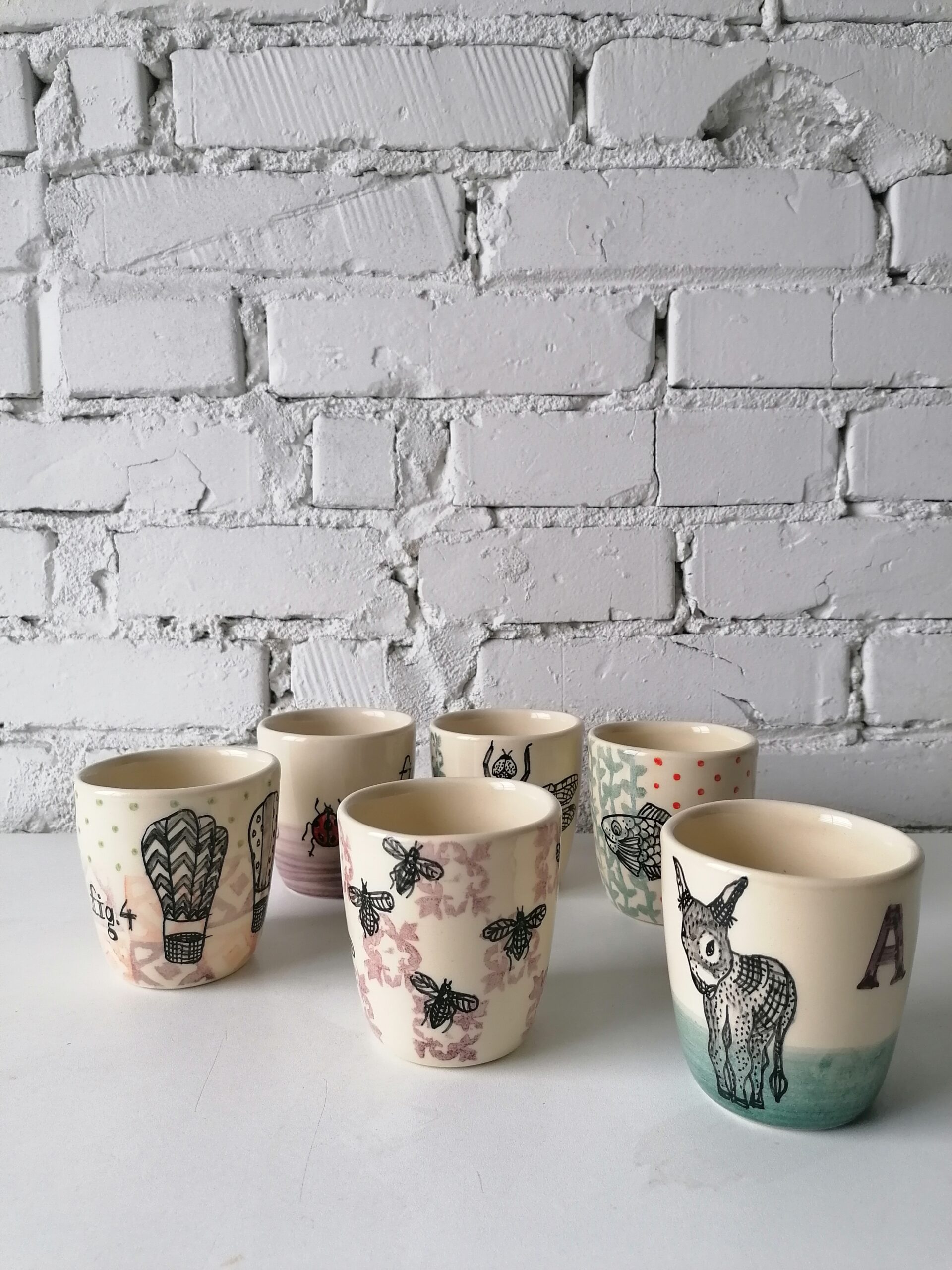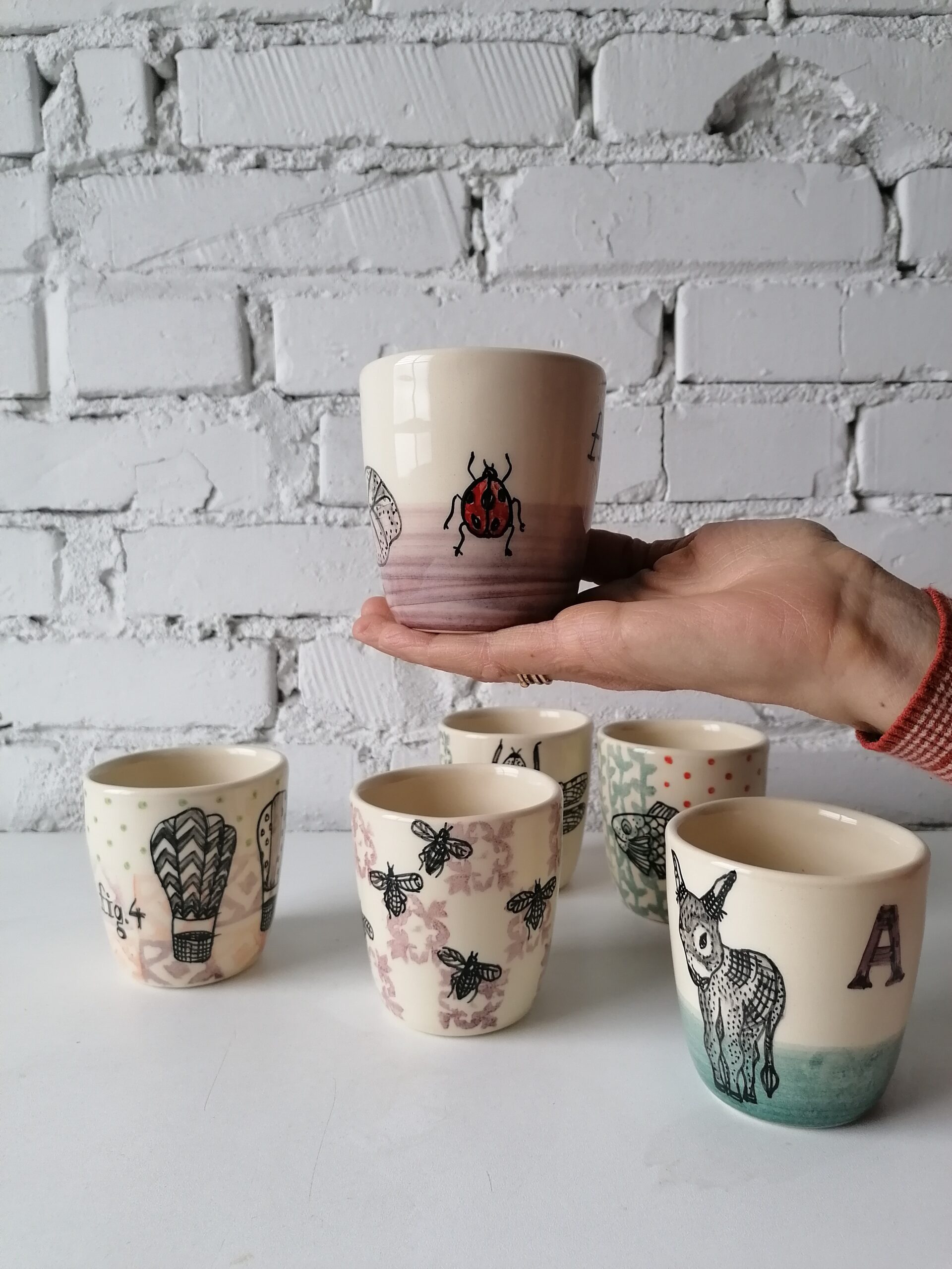 • Bicchiere in ceramica realizzata e decorata a mano, in argilla bianca