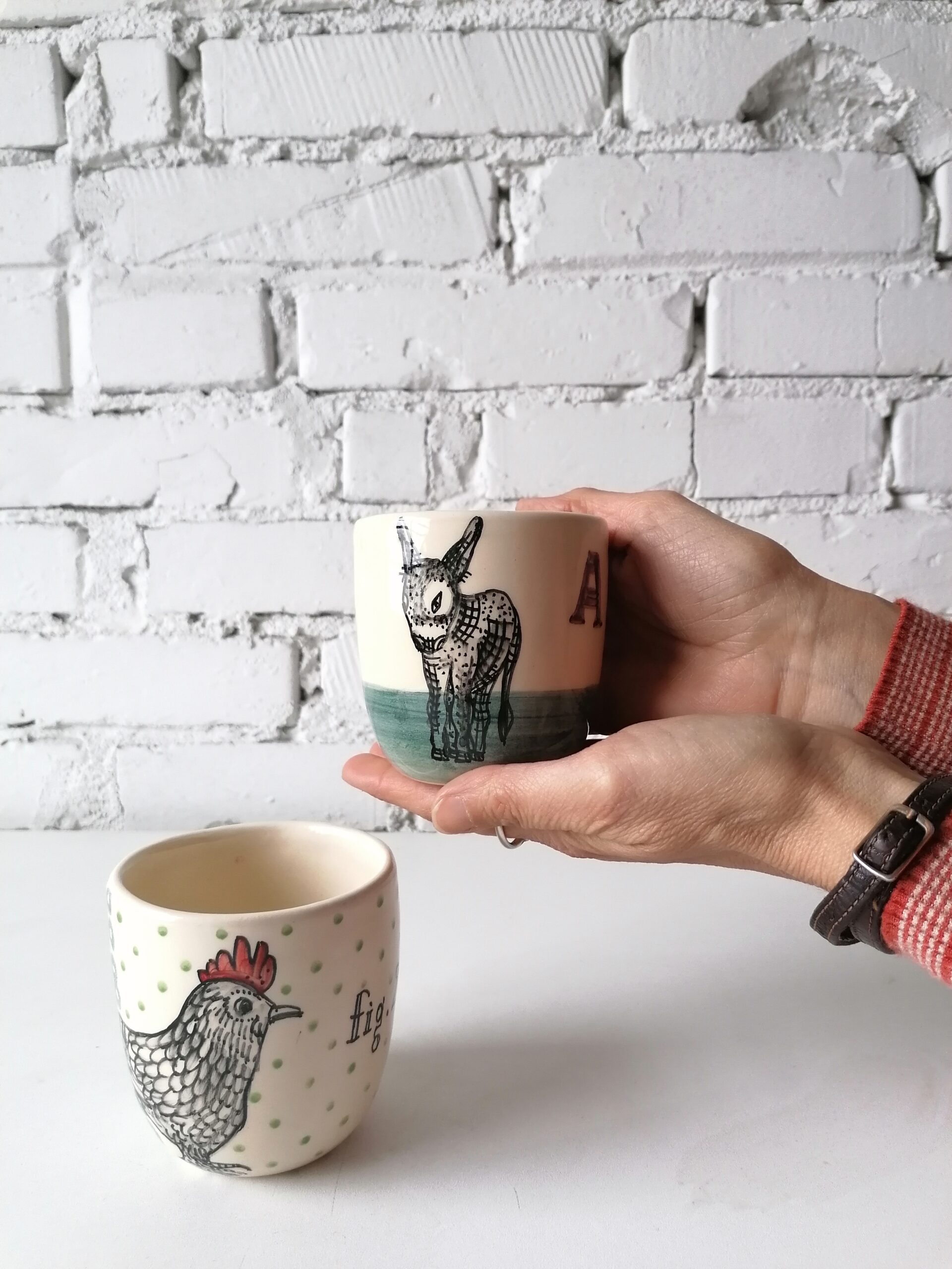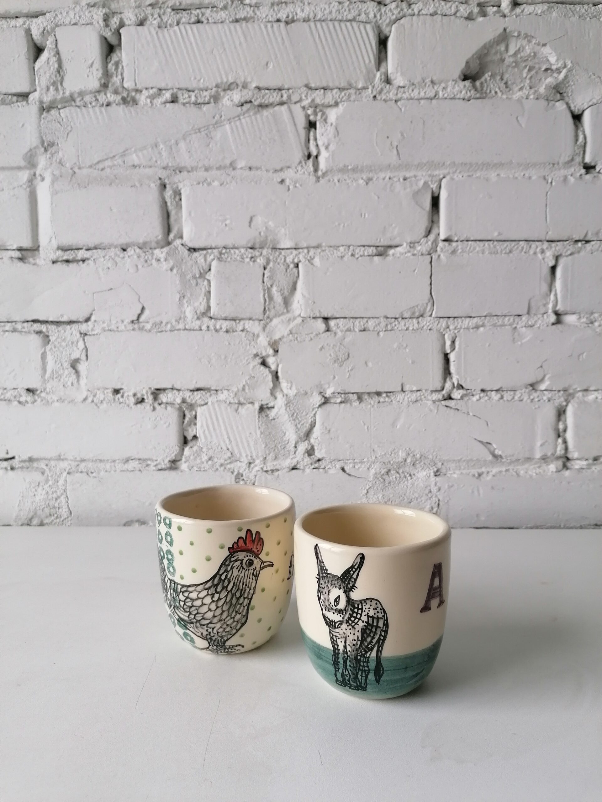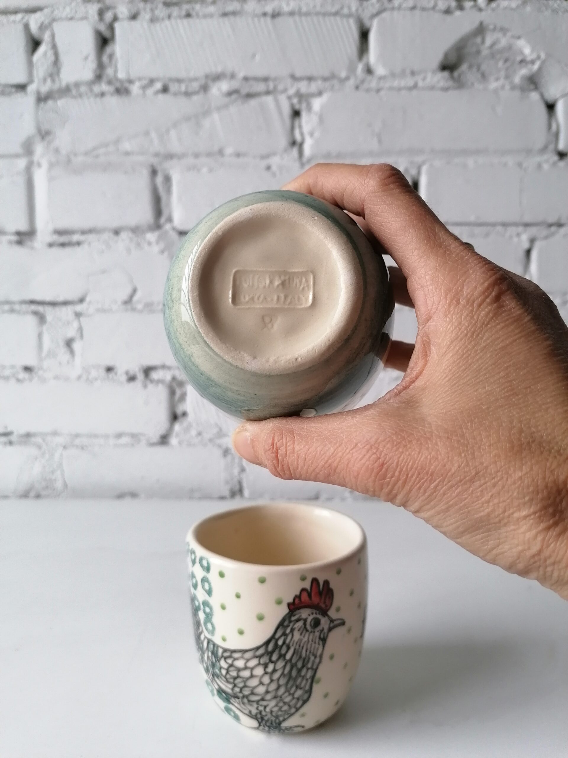 Bicchiere in ceramica realizzata e decorata a mano, in argilla bianca