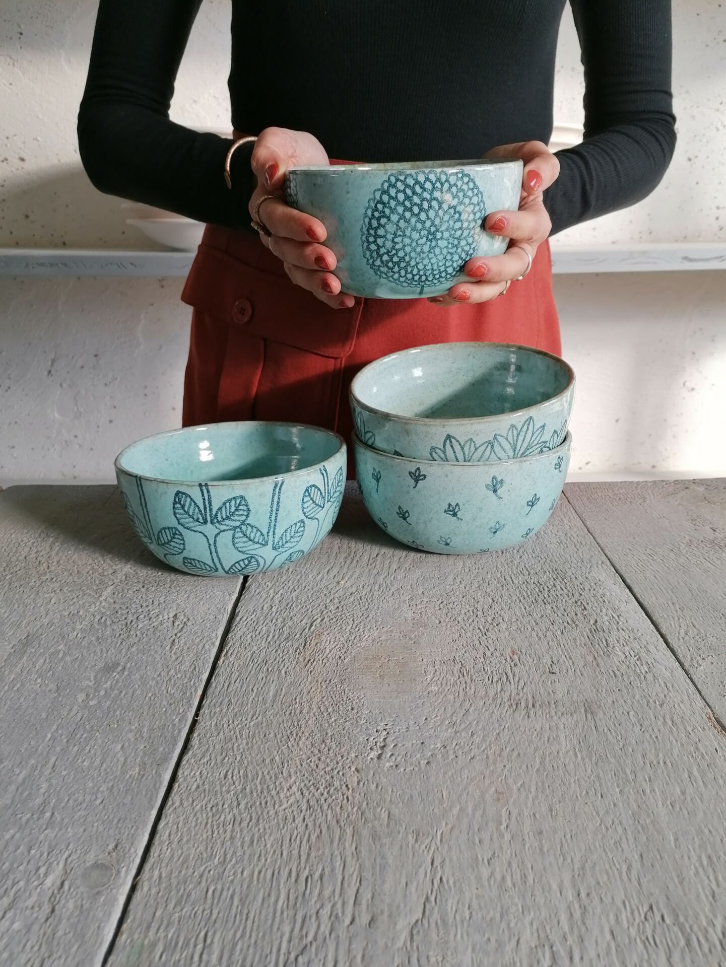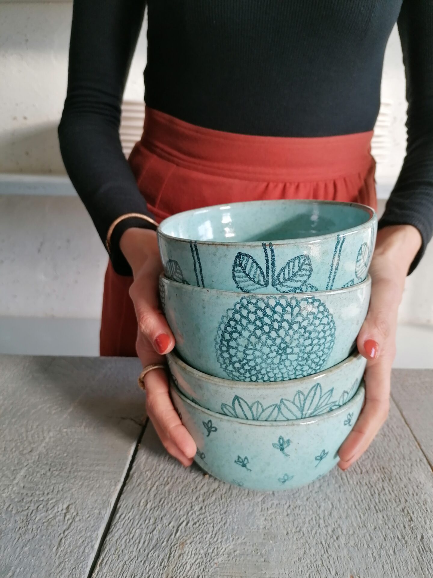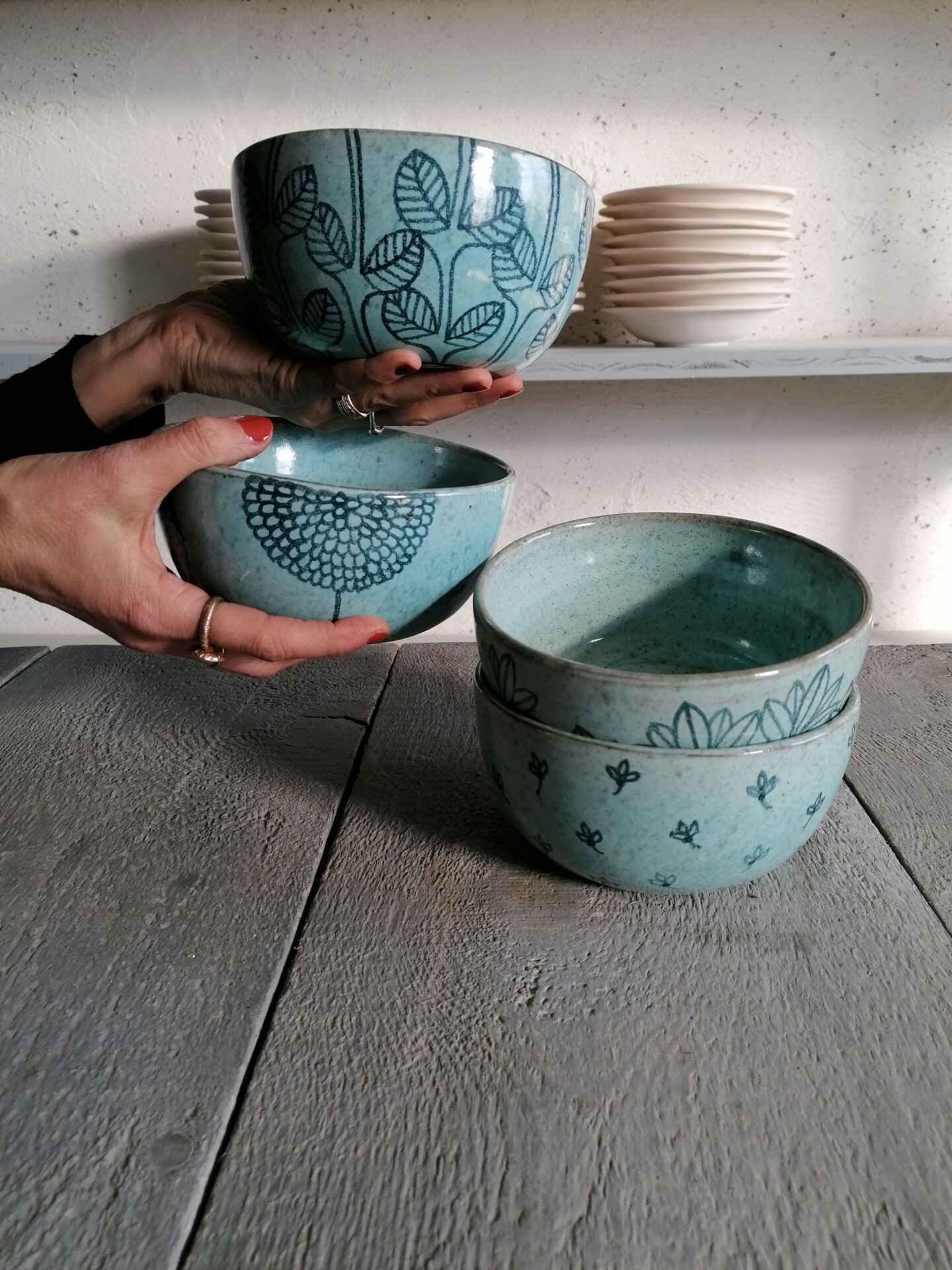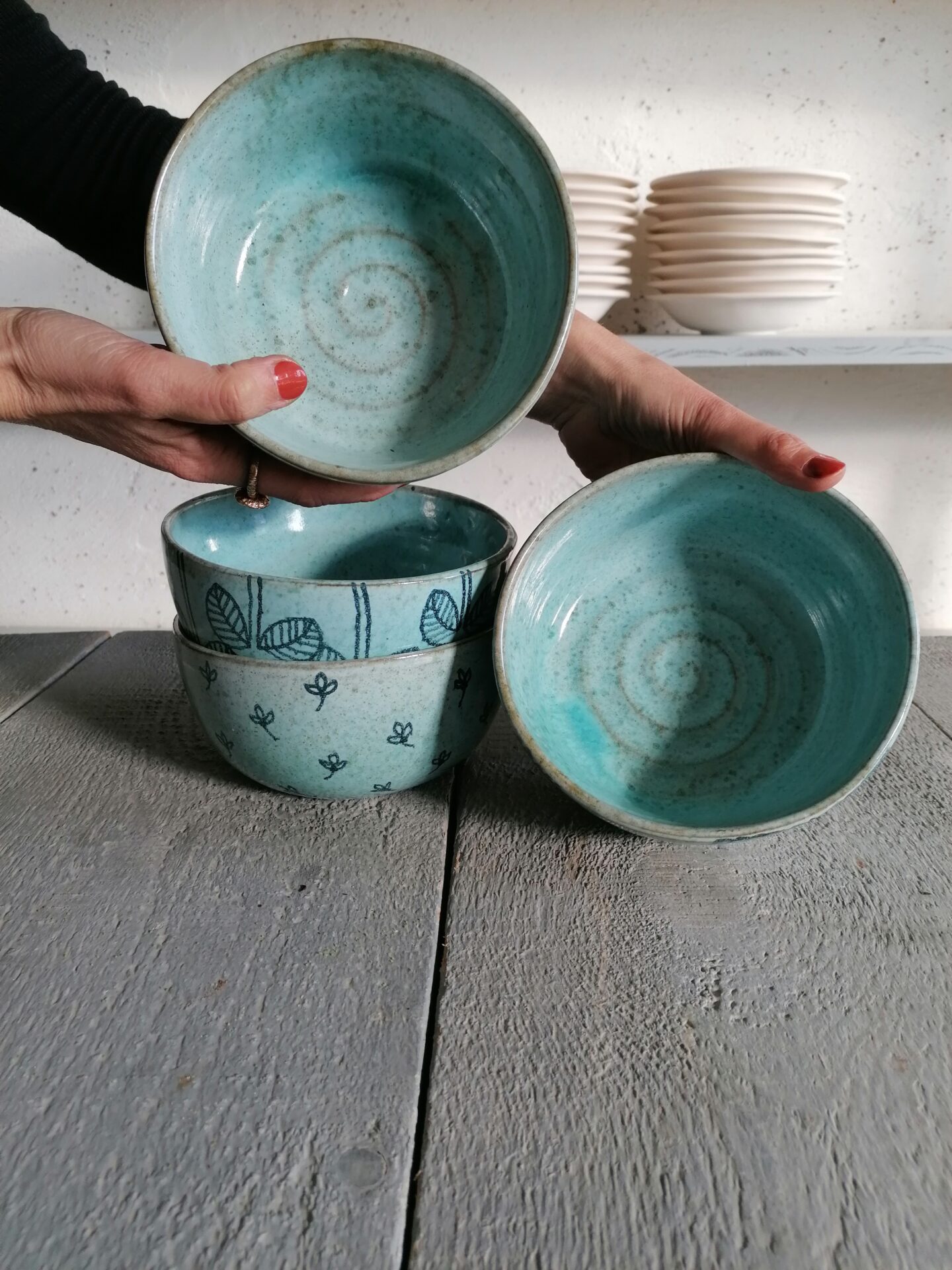Nella collezione Fluida un colore liquido, appunto fluido, esalta la terracotta sottostante e fa muovere i decori rendendo, ogni volta, una sorpresa l’oggetto che esce dal forno.