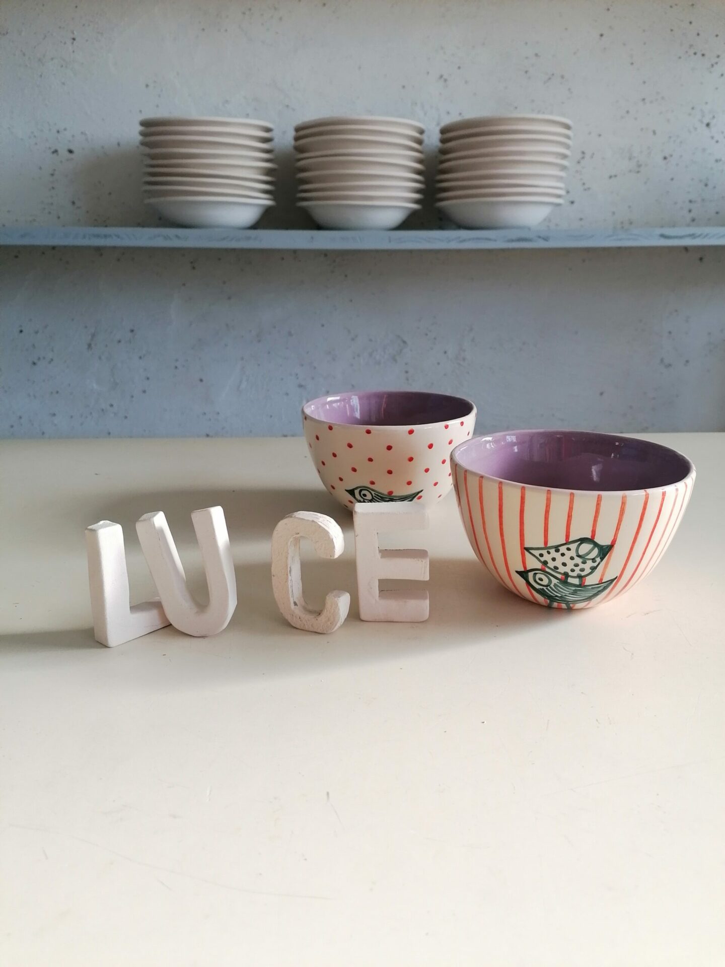 Prende il nome dal nostro bambino Lucio che l’ha ispirata. Protagonista è Lucellino Pio Pio che fa la nanna o è sveglio in mezzo a righe e pois celesti.
