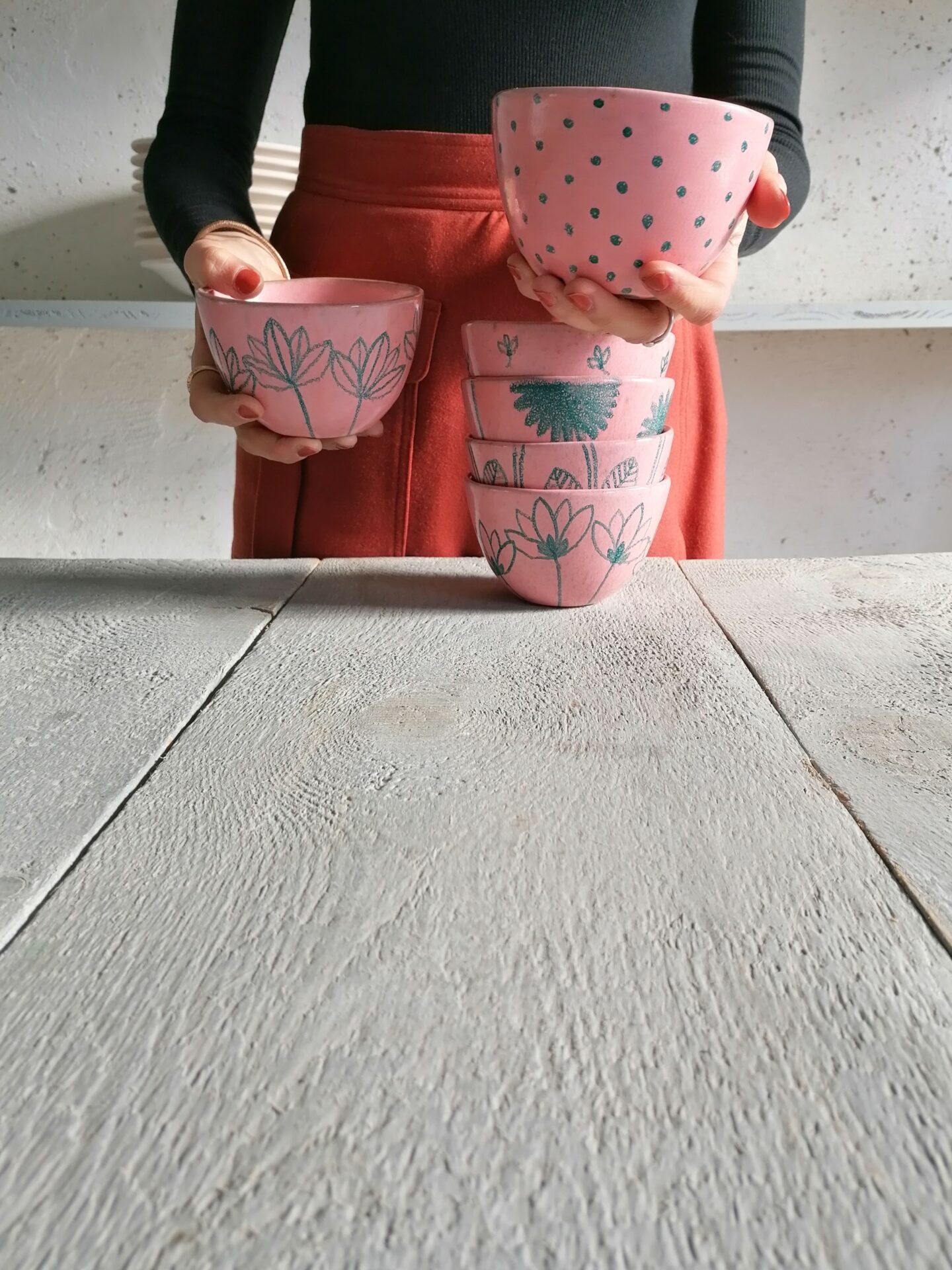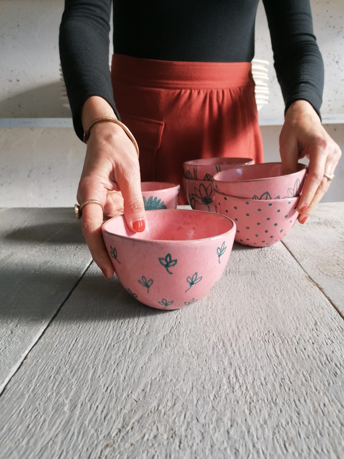 Nella collezione Fluida un colore liquido, appunto fluido, esalta la terracotta sottostante e fa muovere i decori rendendo, ogni volta, una sorpresa l’oggetto che esce dal forno.
