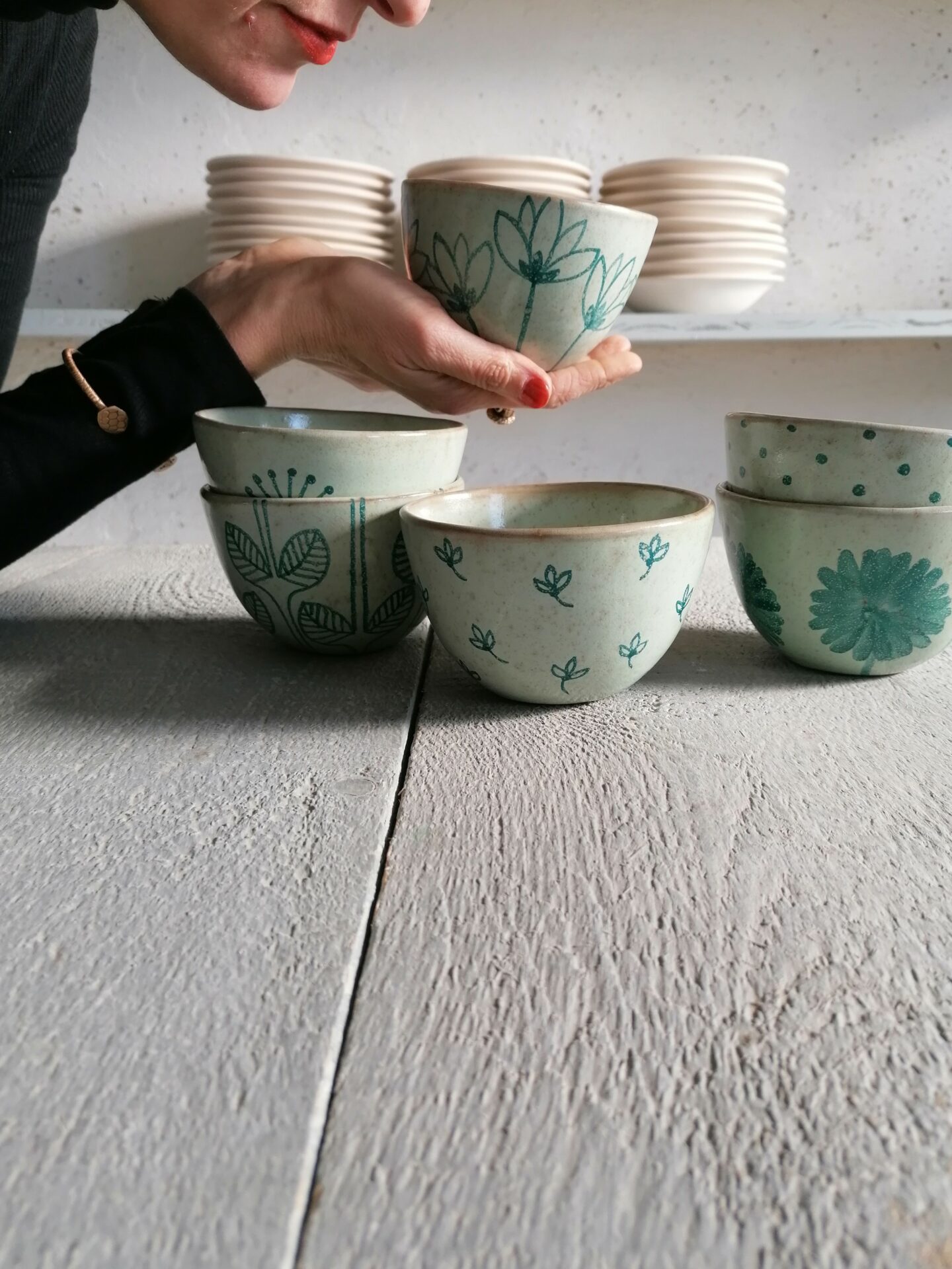 Nella collezione Fluida un colore liquido, appunto fluido, esalta la terracotta sottostante e fa muovere i decori rendendo, ogni volta, una sorpresa l’oggetto che esce dal forno.