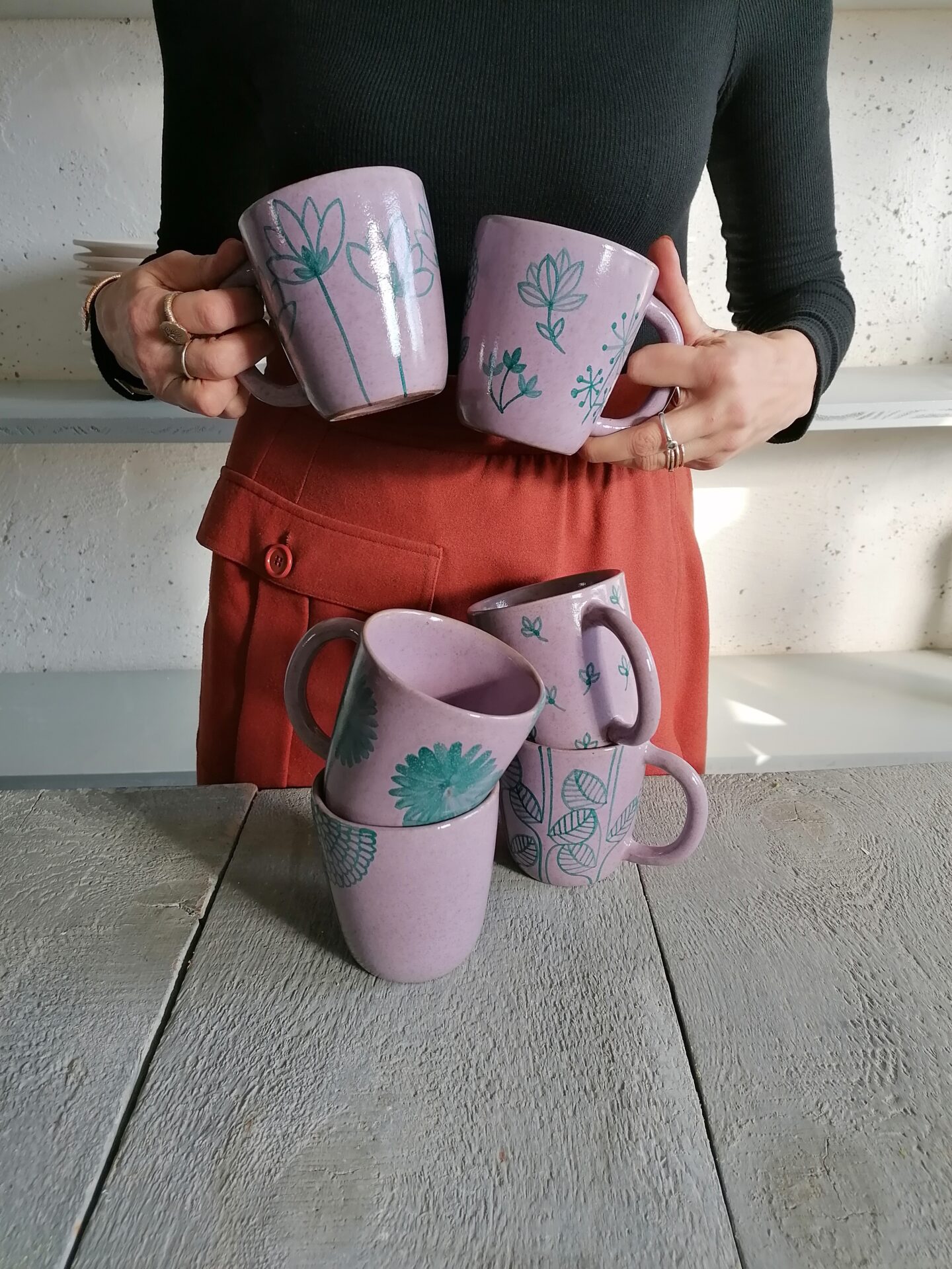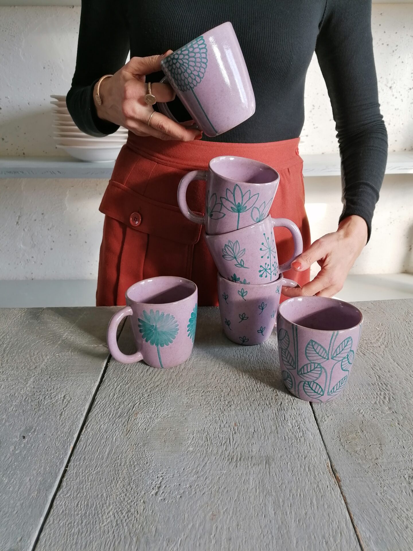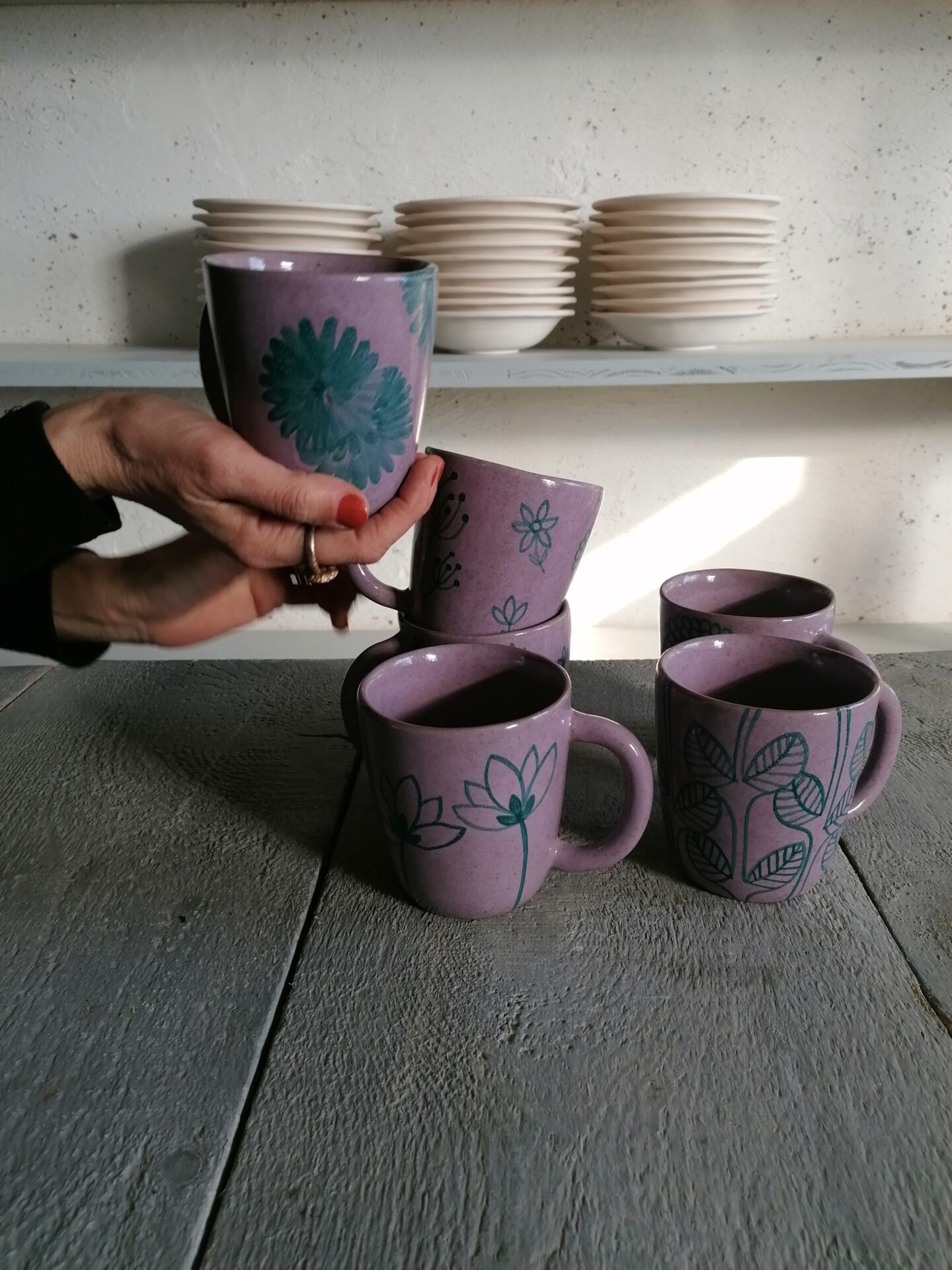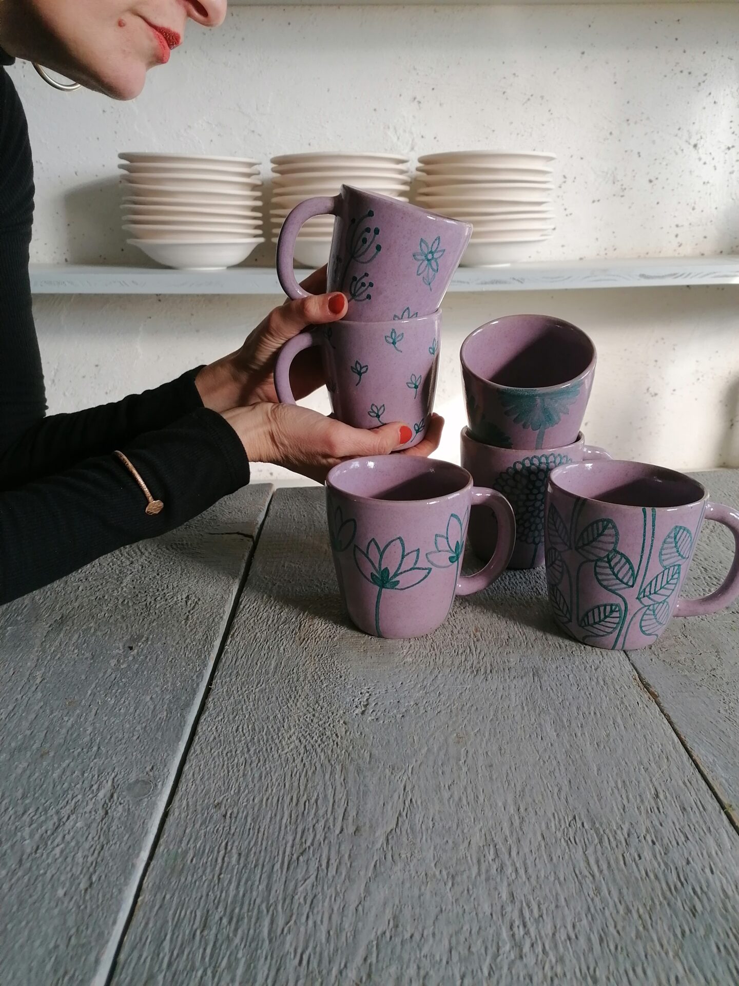 Tazza in ceramica realizzata e decorata a mano, in argilla rossa