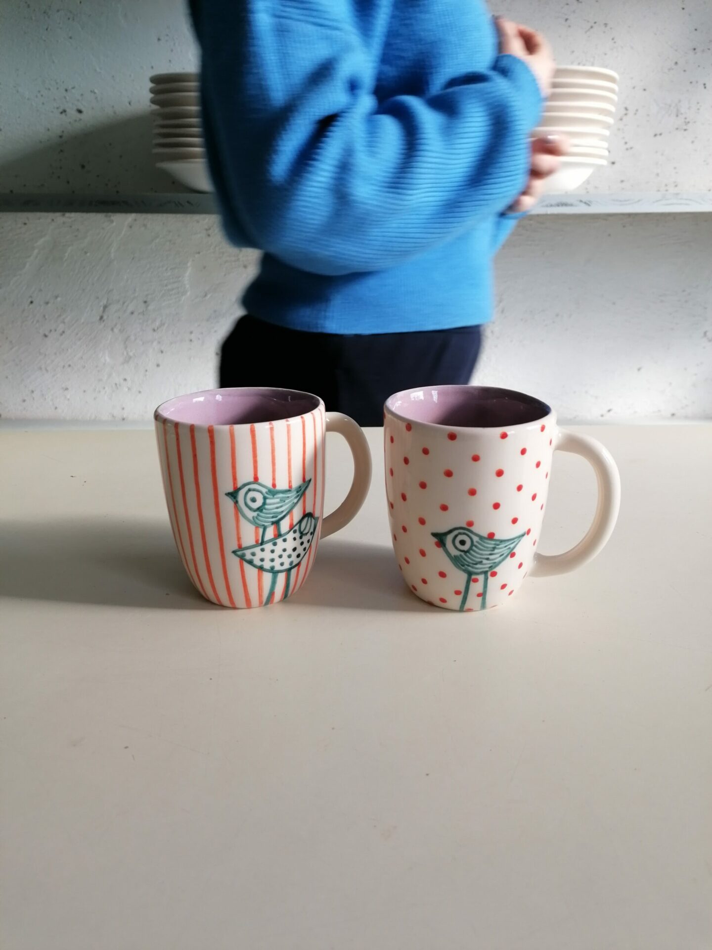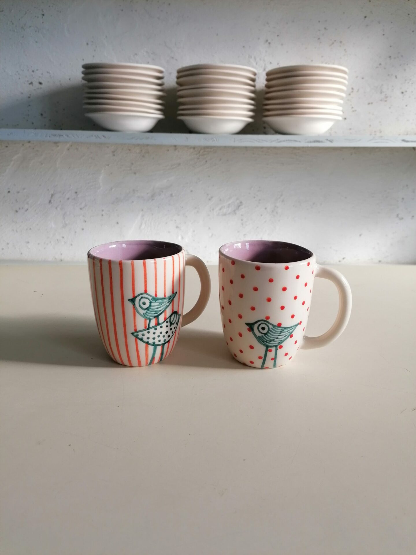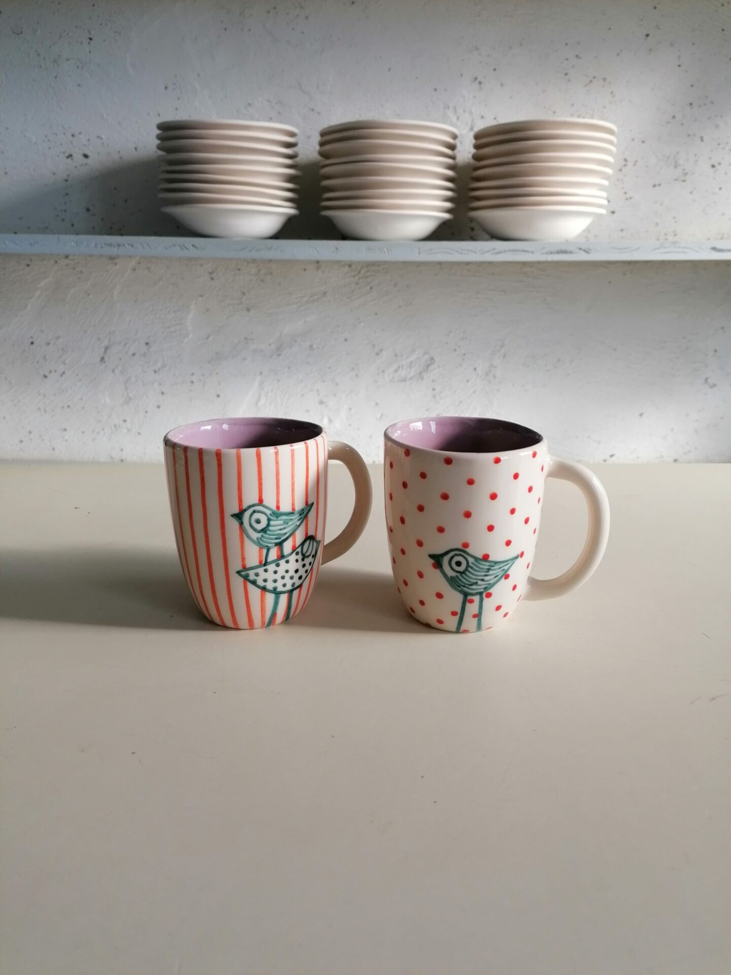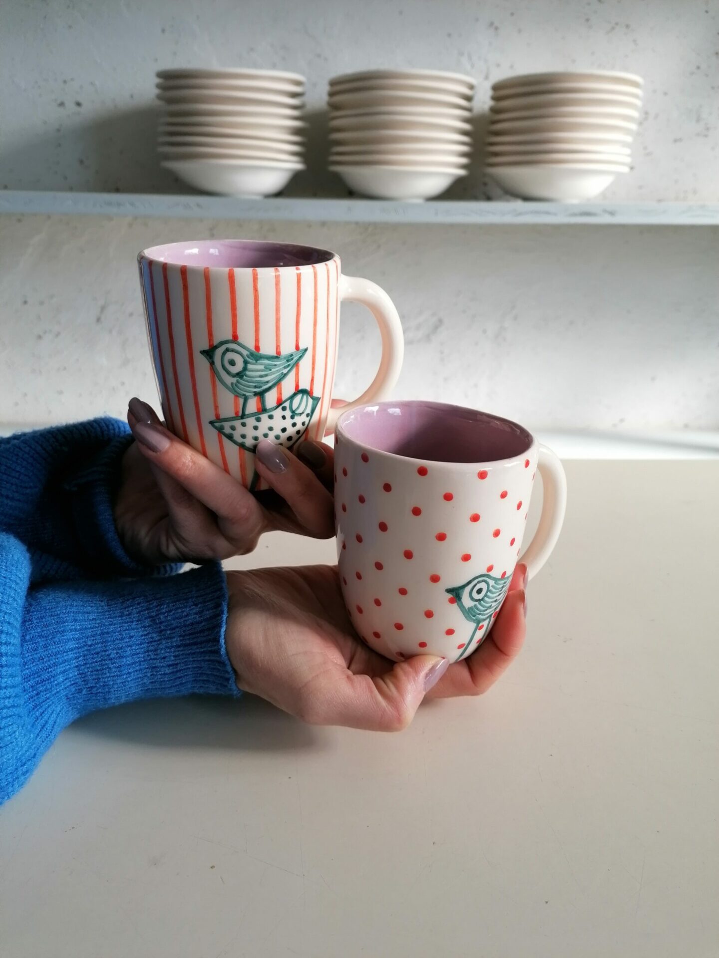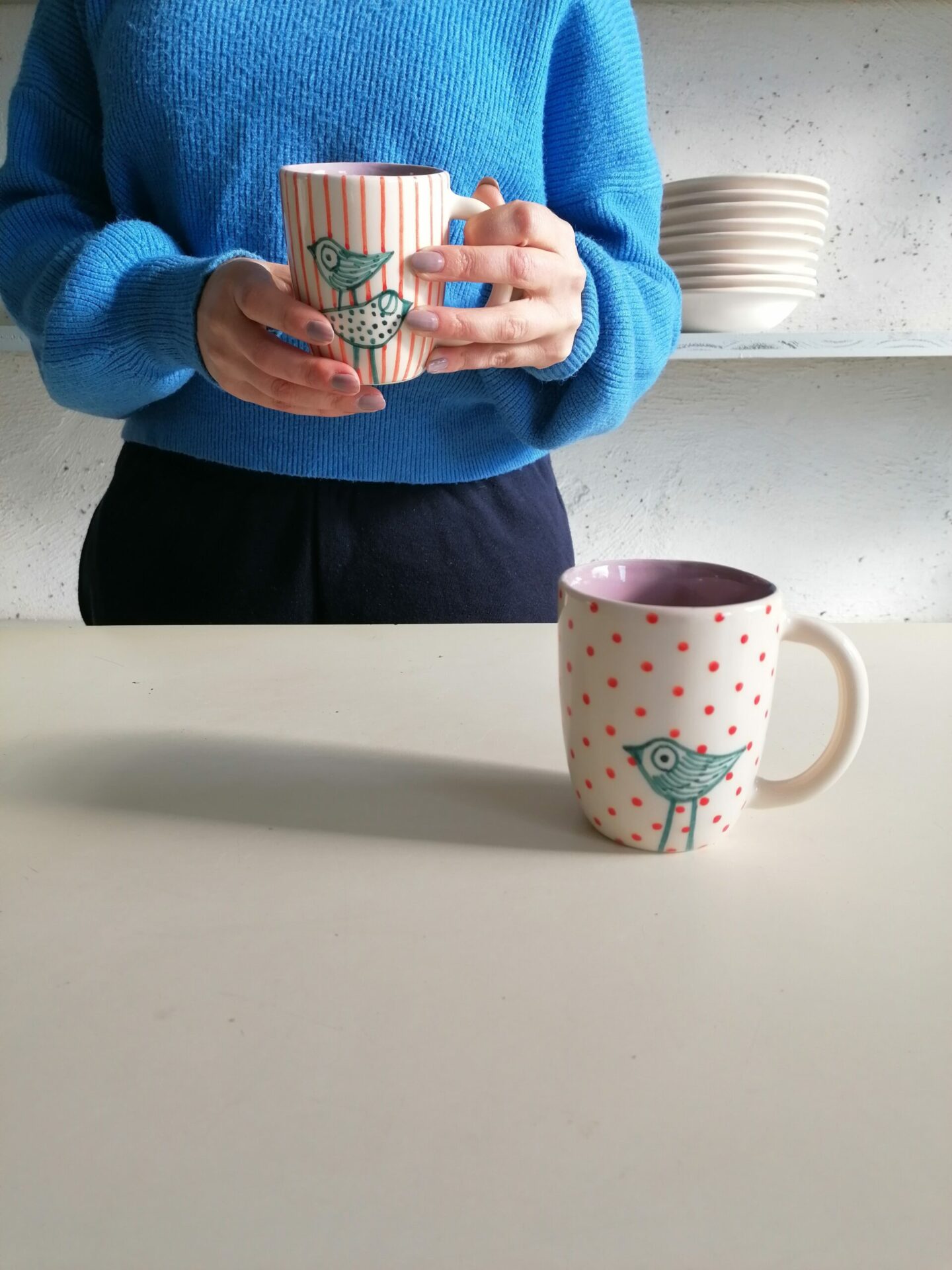 Tazza in ceramica realizzata e decorata a mano, in argilla bianca