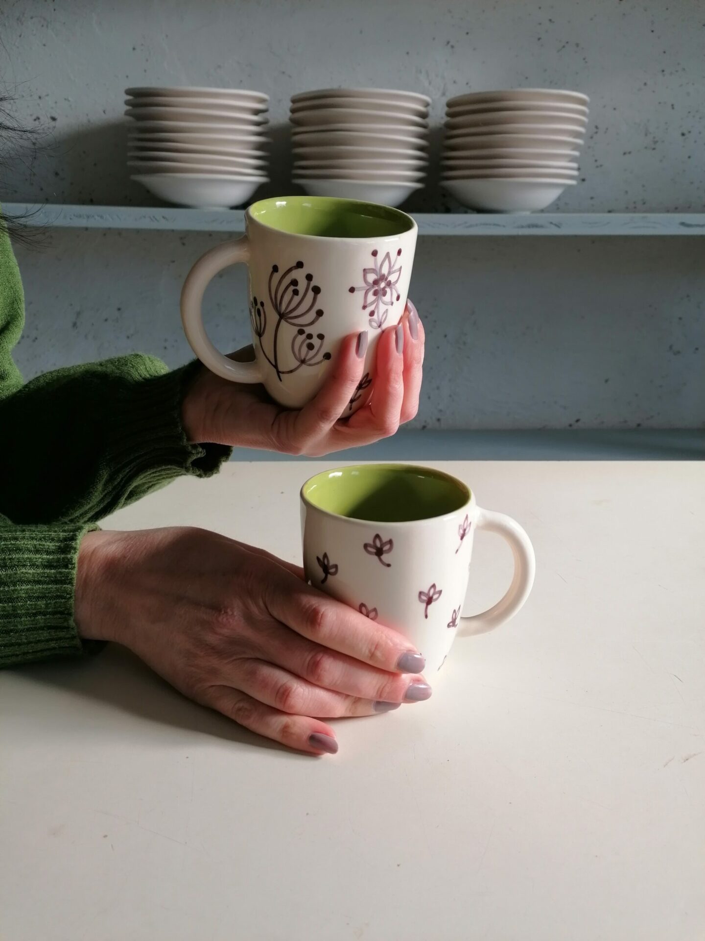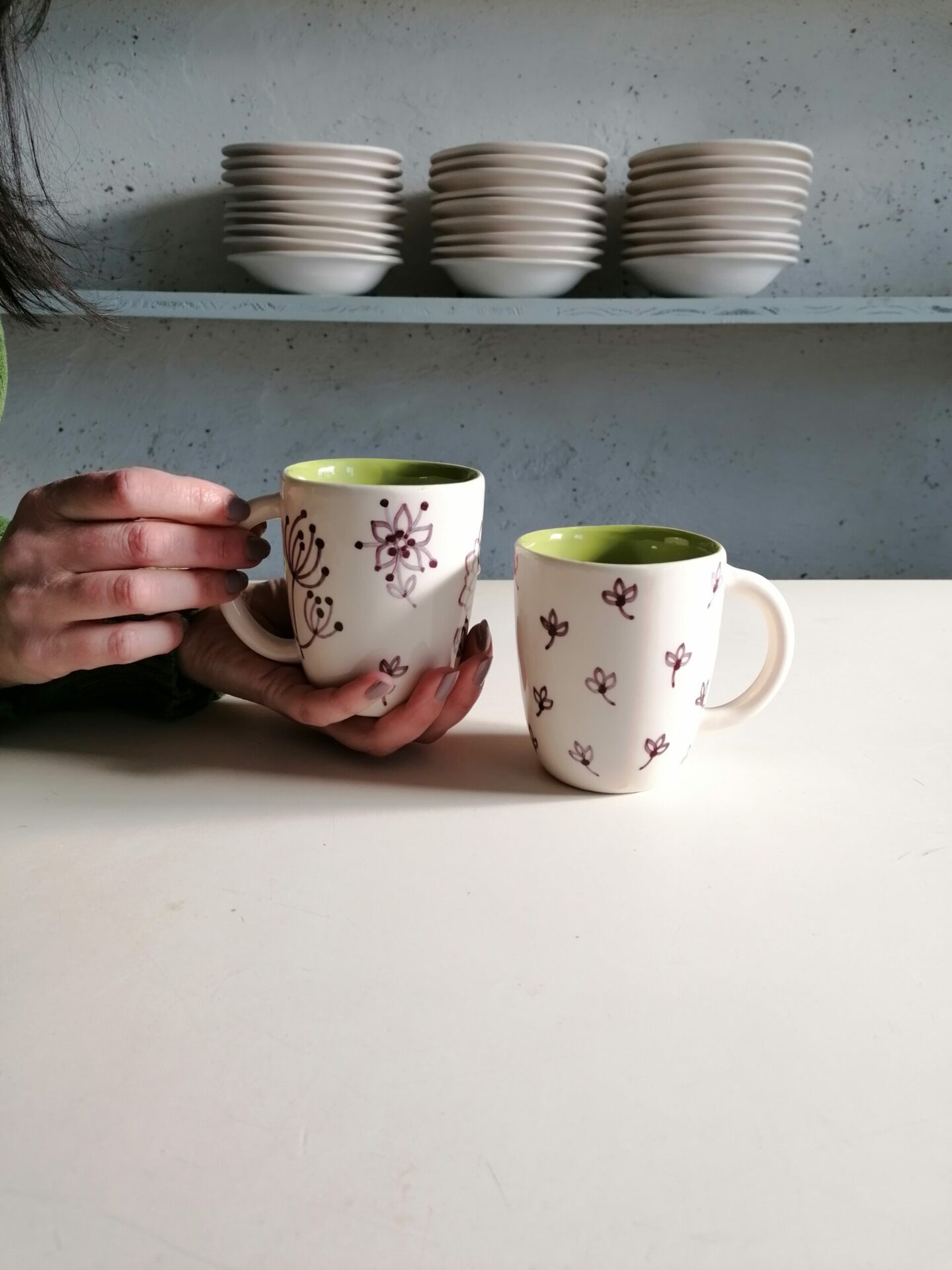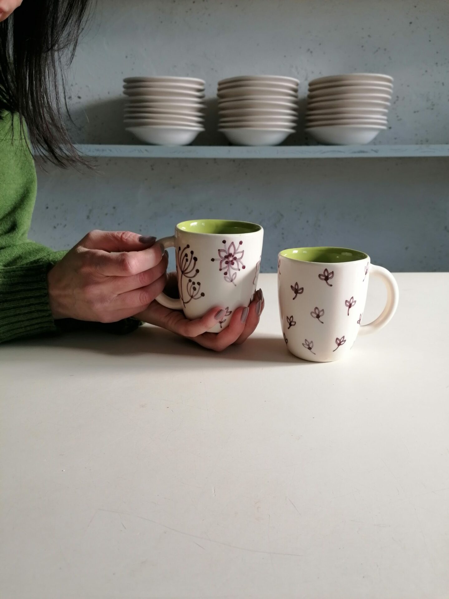 Su una base bianca con segni sintetici in blu marrone e rosso, la collezione Grafica disegna fiori stilizzati e forme geometriche.