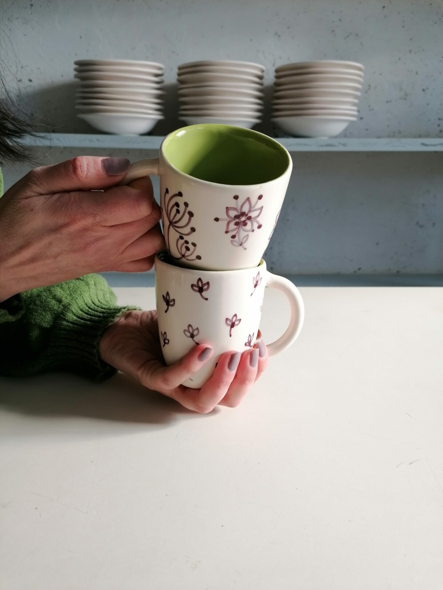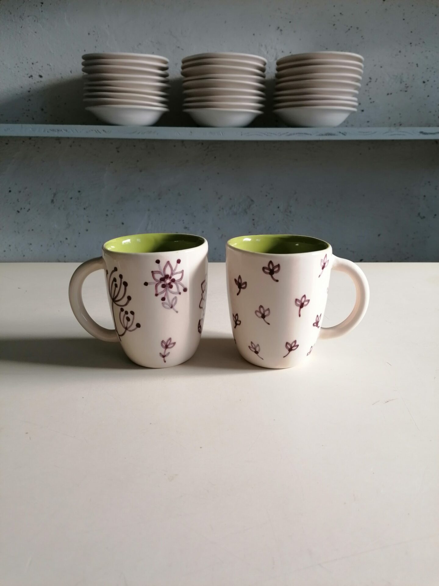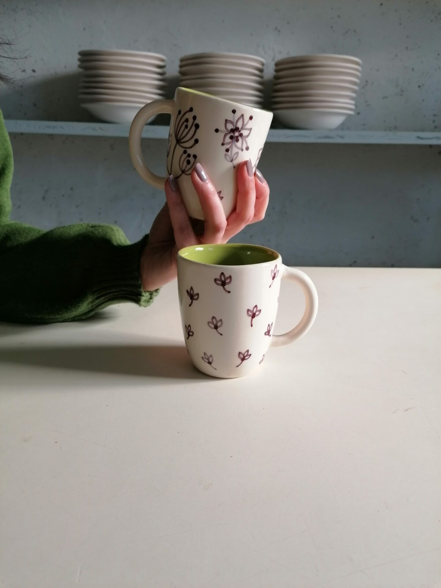 Su una base bianca con segni sintetici in blu marrone e rosso, la collezione Grafica disegna fiori stilizzati e forme geometriche.