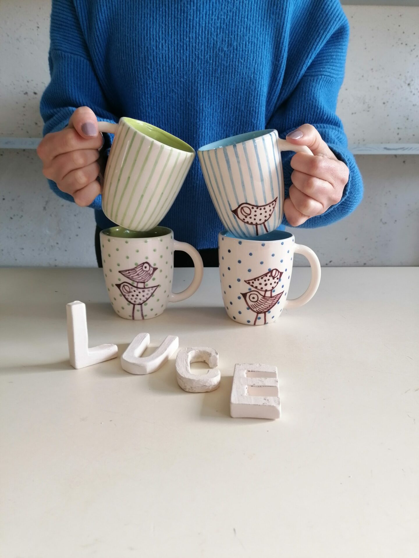 Tazze ideali per la colazione interamente prodotte e decorate a mano.