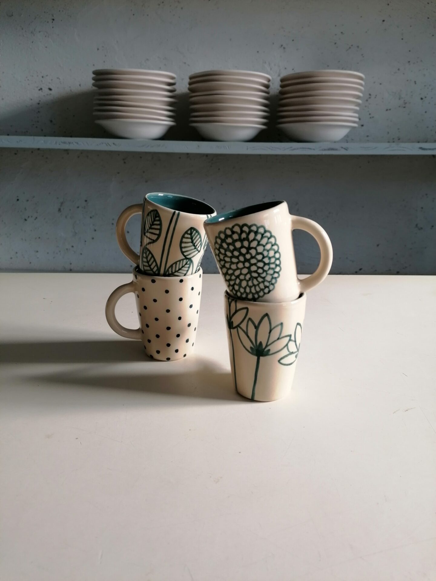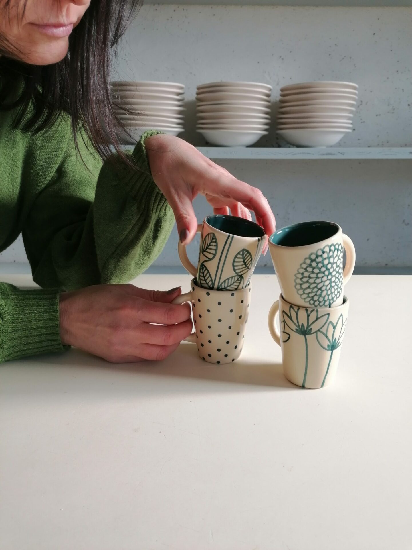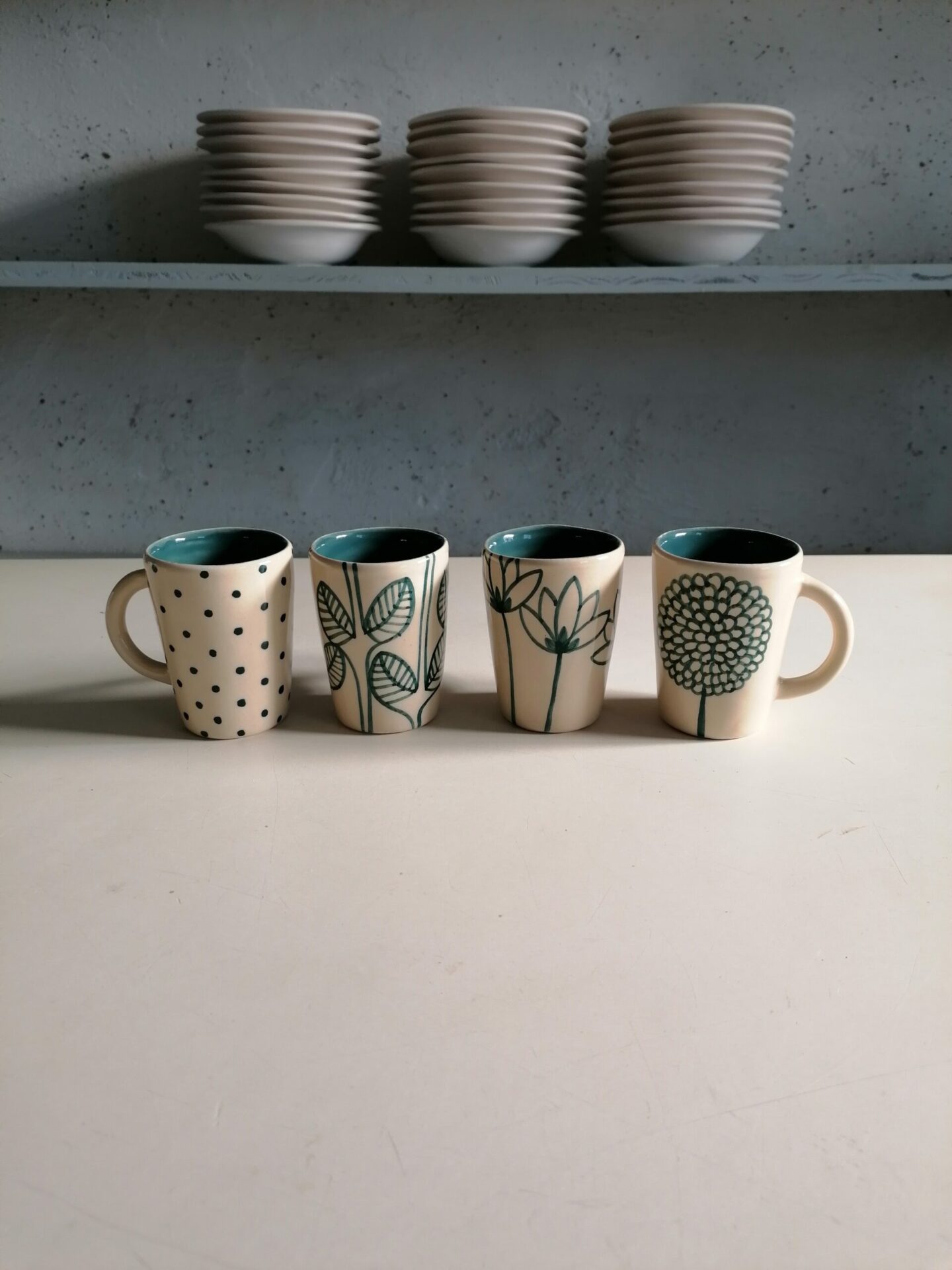 Set di tazzine da caffè interamente prodotte e decorate a mano.