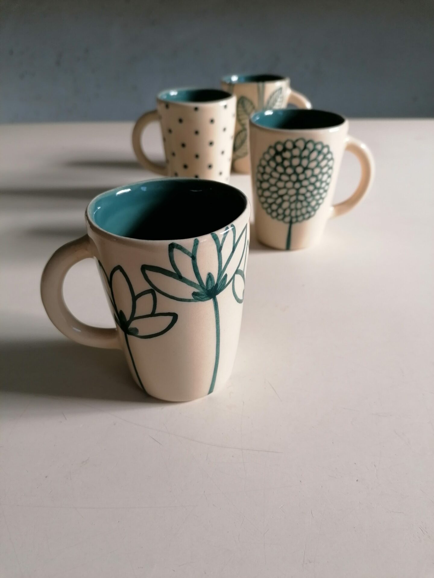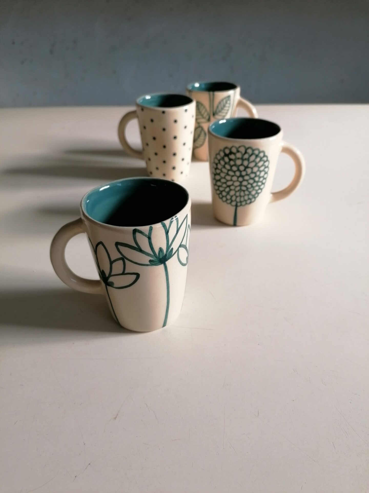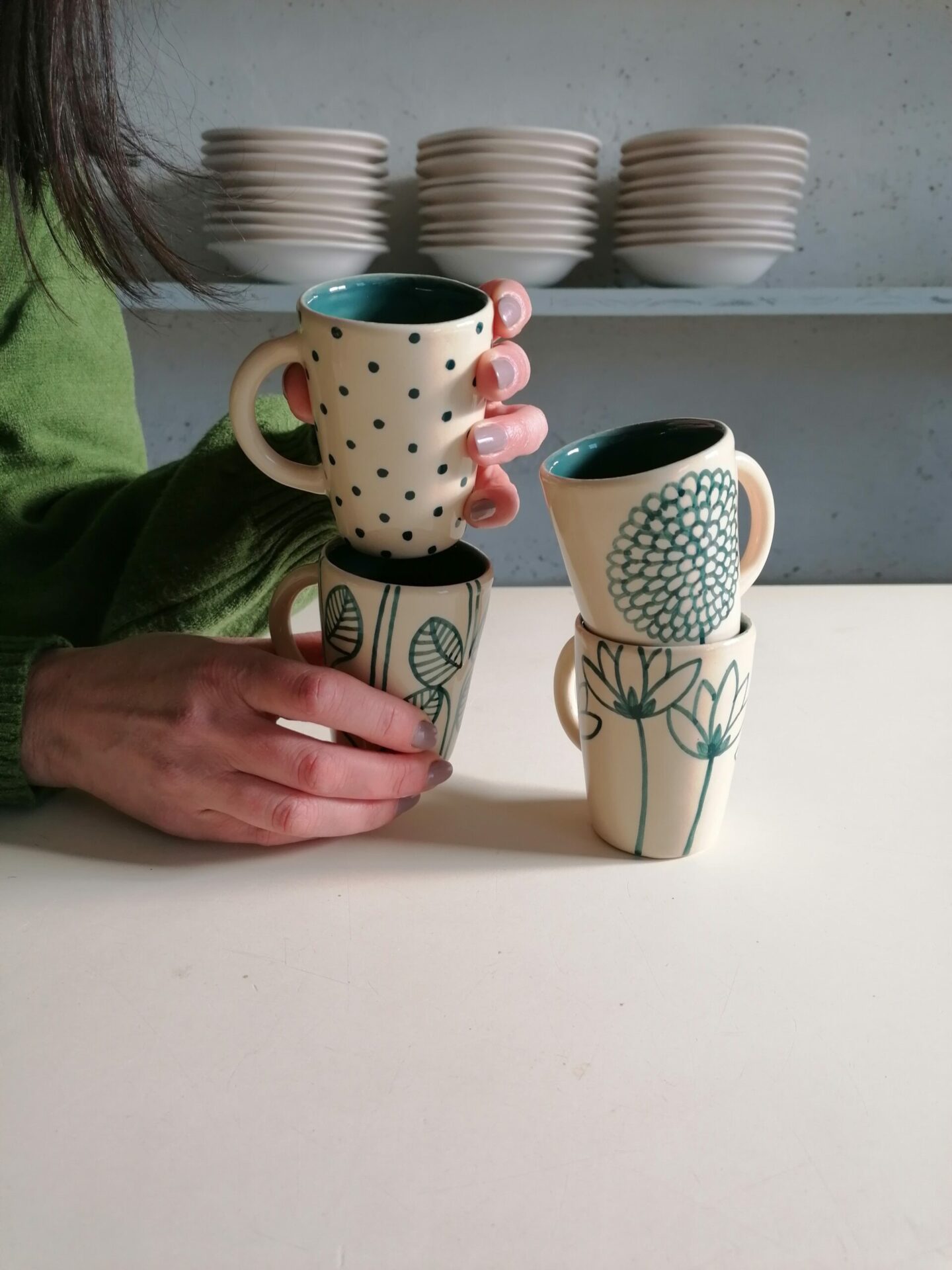Set di tazzine da caffè interamente prodotte e decorate a mano.