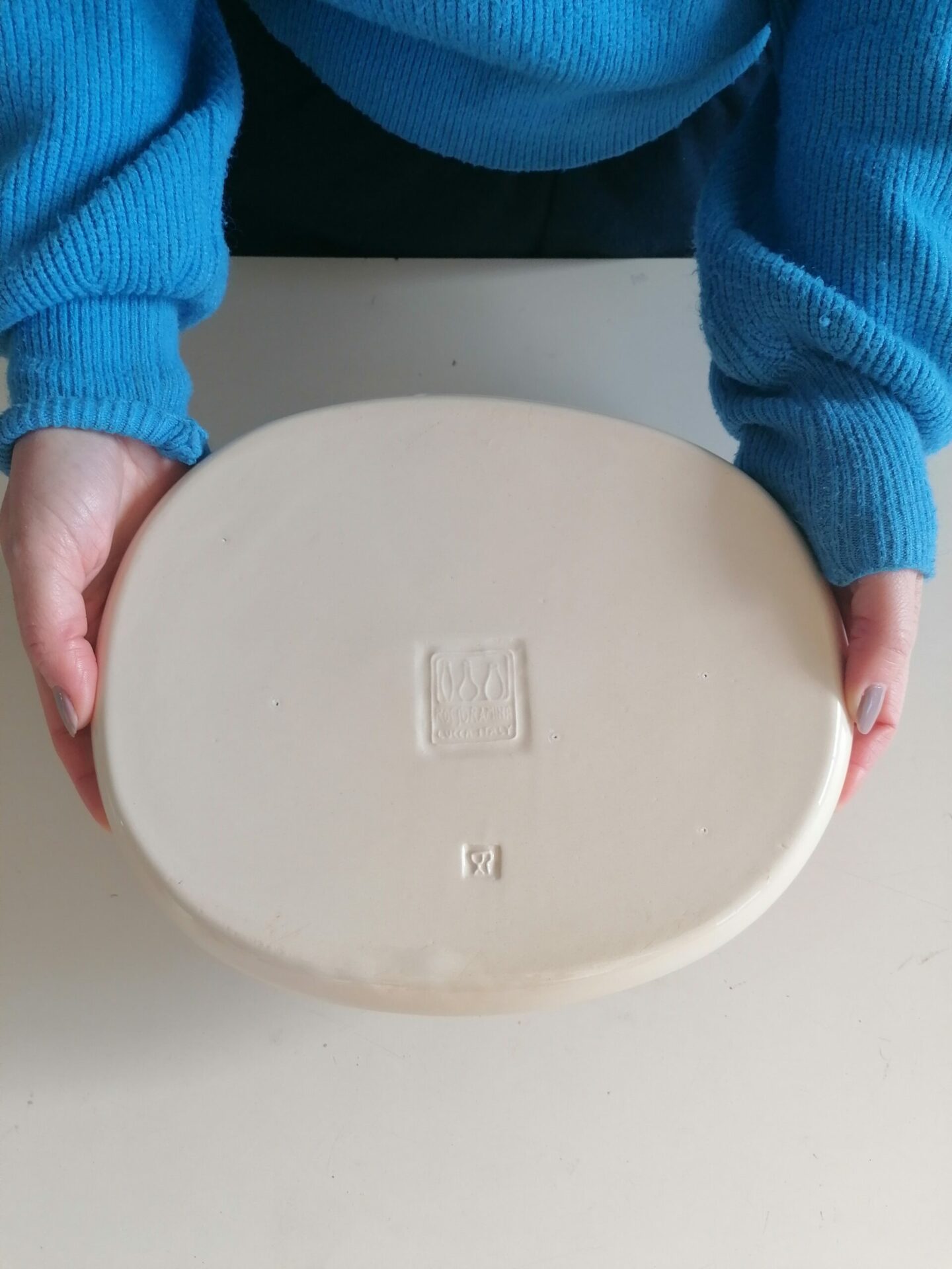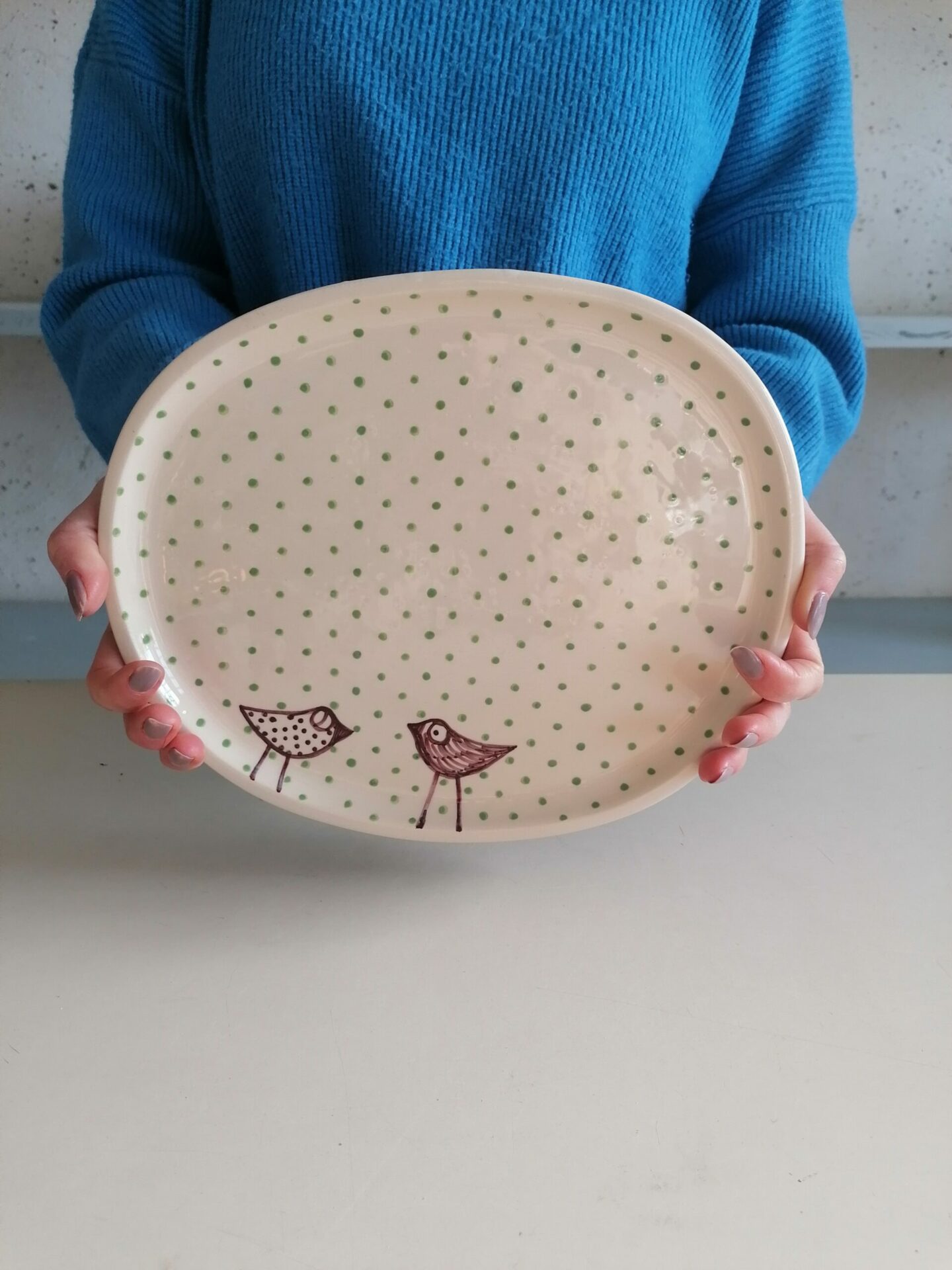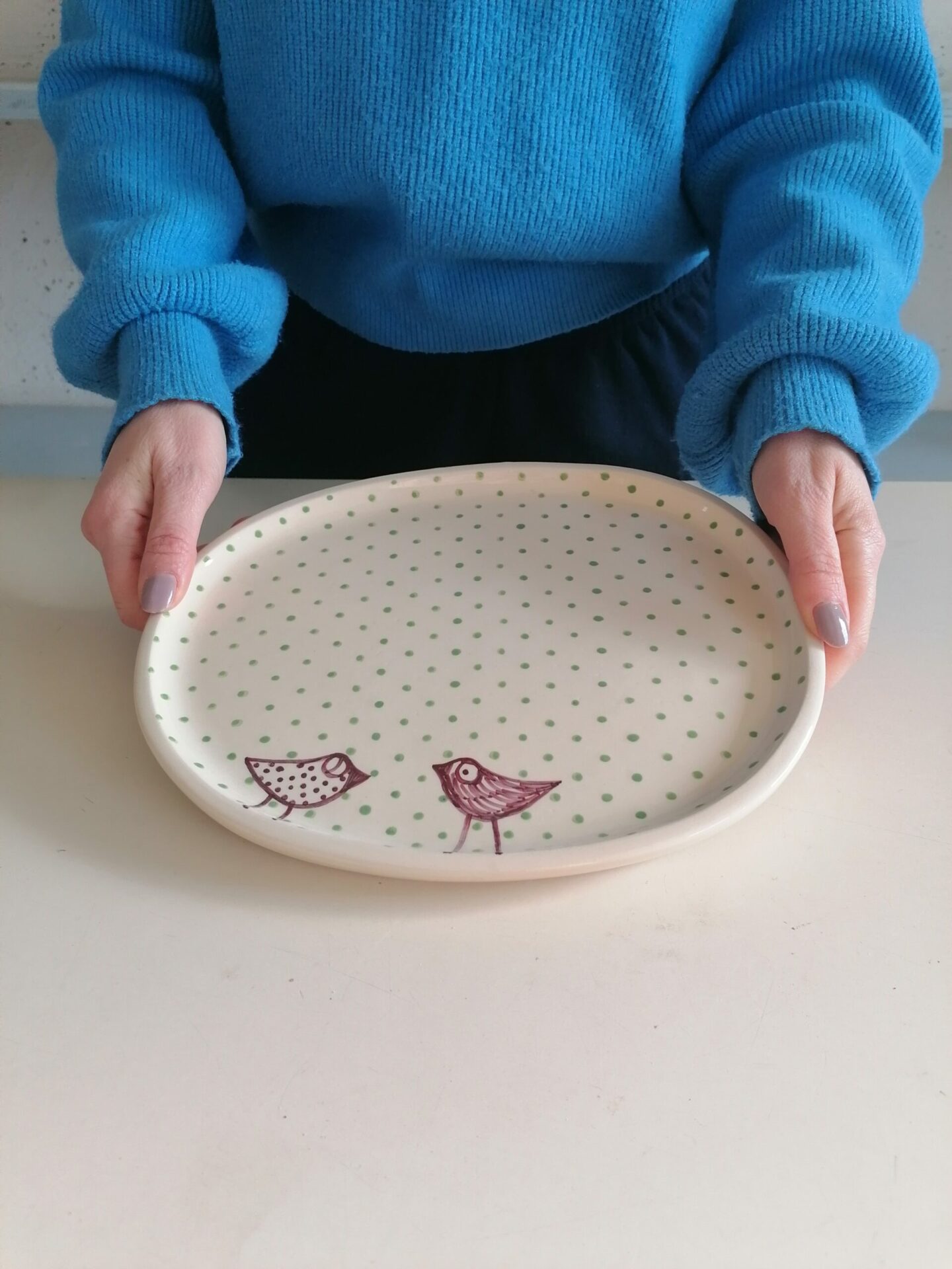 Vassoio in ceramica realizzata e decorata a mano, in argilla bianca